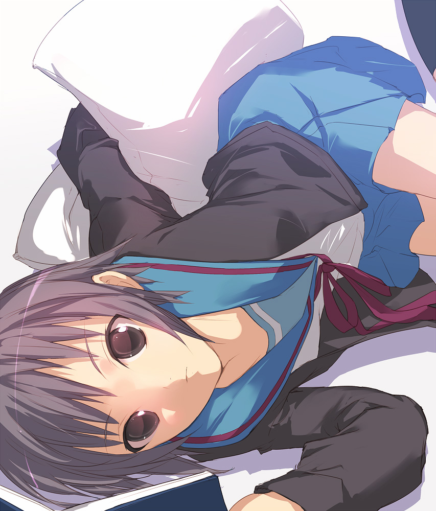 00sbrown eyesbrown haircardiganlyingpillowpurple hairschool uniformserafukushort hairskirtsolo
