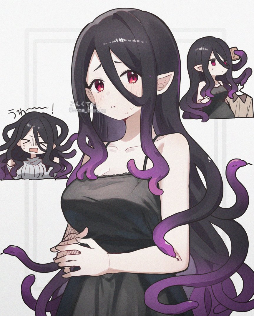 1boy1girlartist namebare armsbare shouldersblack dressblack hairblushbreastscleavageclosed mouthclothes hangercollarbonedressgradient hairhair between eyeslarge breastslong hairlooking at viewermulticolored hairopen mouthparted lipspointy earspurple hairred eyessnake hairsweattwitter username