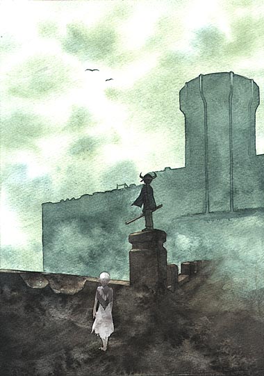 1boy1girlbuildingcloudcloudy skydressfogfull bodyhornssilhouetteskystandingsurcoattabardtorn clothes
