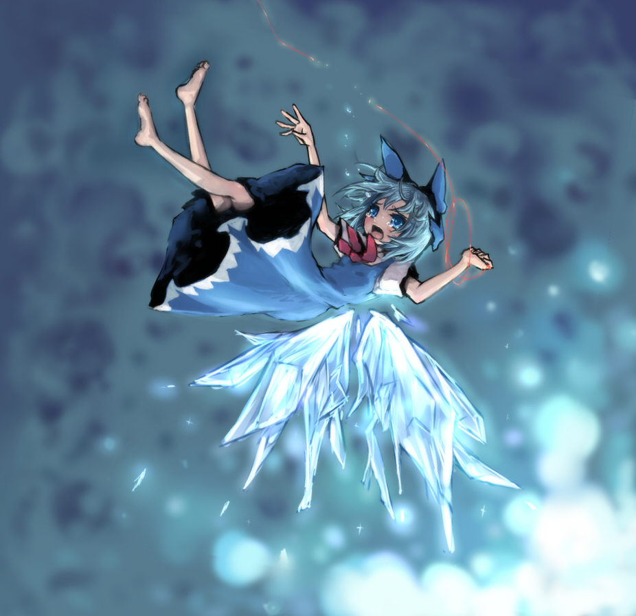 1girlbarefootblue eyesblue hairdressfallingfemale focusmatching hair/eyesribbonshort hairsolostringstring of fatetearswings