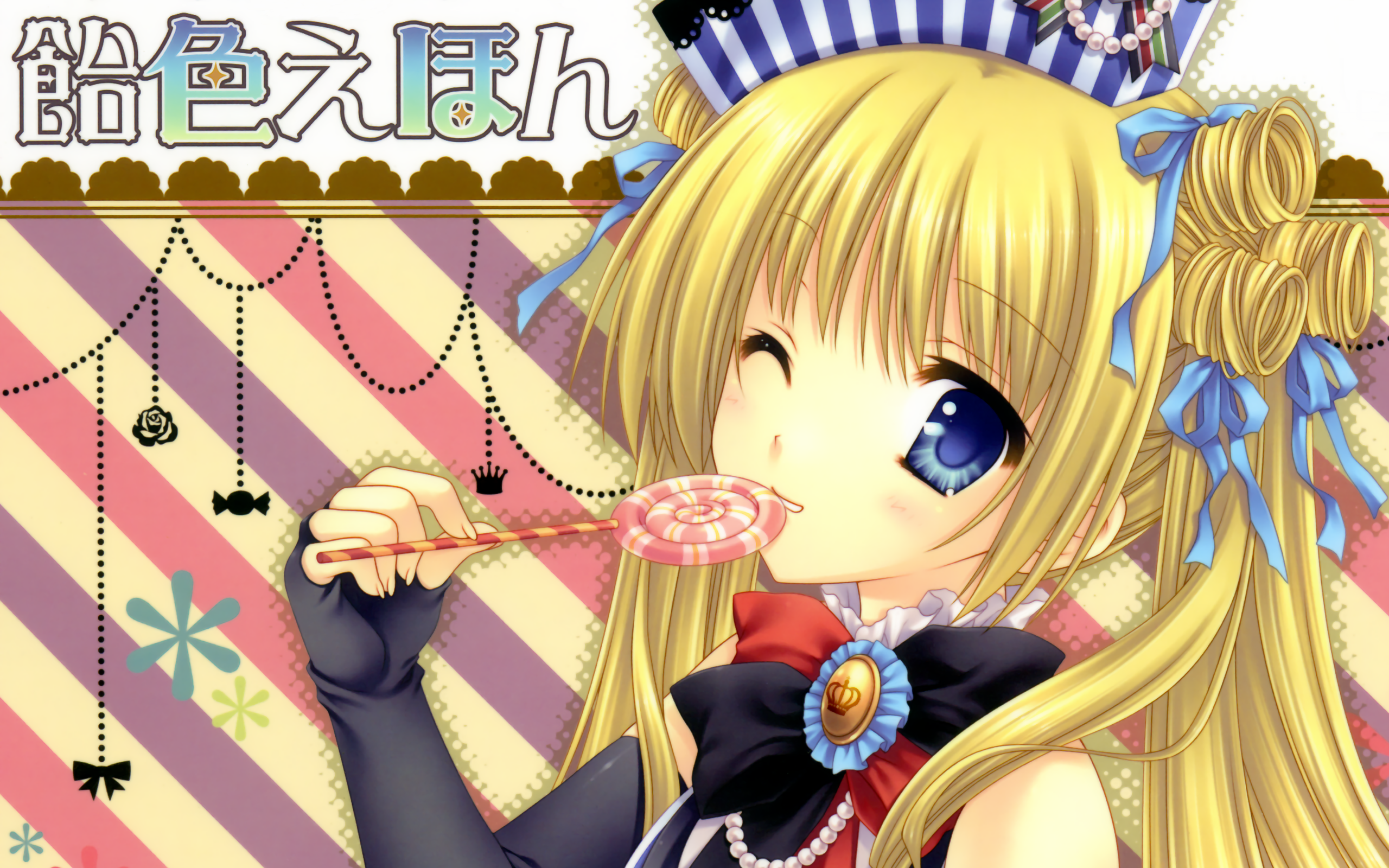 1girlblonde hairblue eyescandyfemale focusfoodgloveslollipoplong hairone eye closedsoloswirl lollipopwink