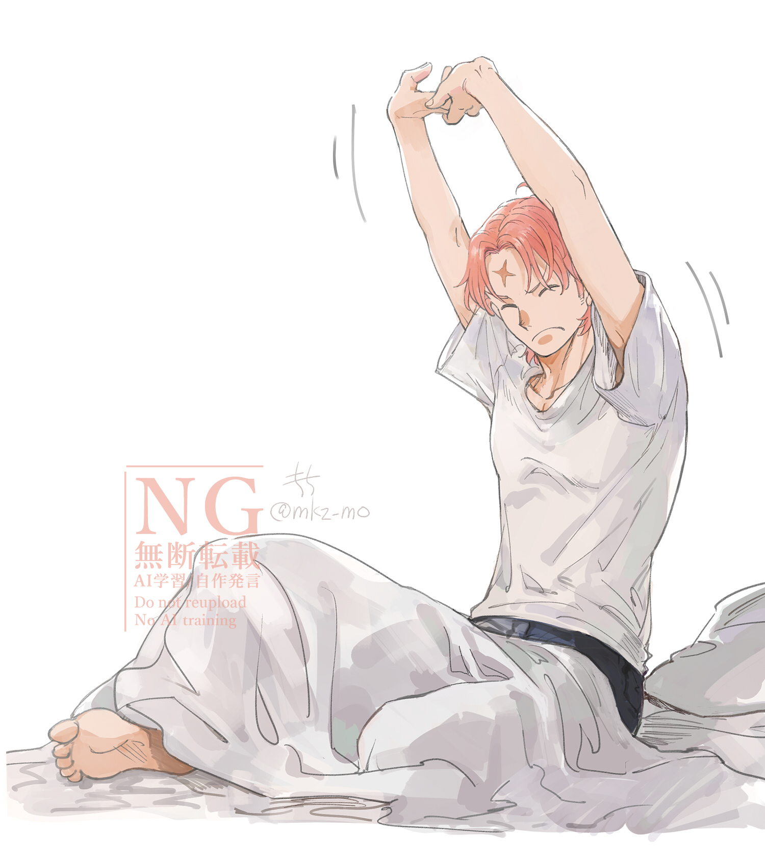 1boyarms upbarefootclosed eyesclosed mouthfrownmale focusscarscar on facescar on foreheadshirtshort sleevessimple backgroundsolowatermarkwhite shirt