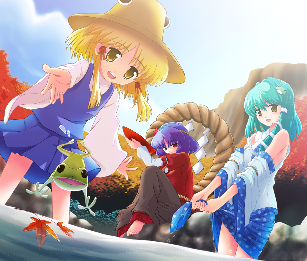 :d3girlsautumn leavesbare shouldersblonde hairbrown eyesdetached sleevesfemale focusfroggreen eyeshatleaflong sleeveslooking at viewermultiple girlsnontraditional mikoopen mouthoutstretched armpurple hairred eyesskirtsmilestandingwadingwaterwringing clotheswringing skirt