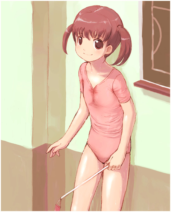 1girlagainst wallbrown eyesbrown hairchildfemale focusgymnasticsleaningleotardlooking at viewerrhythmic gymnasticsribbonribbon batonshort hairshort twintailssmilesolosweattwintails