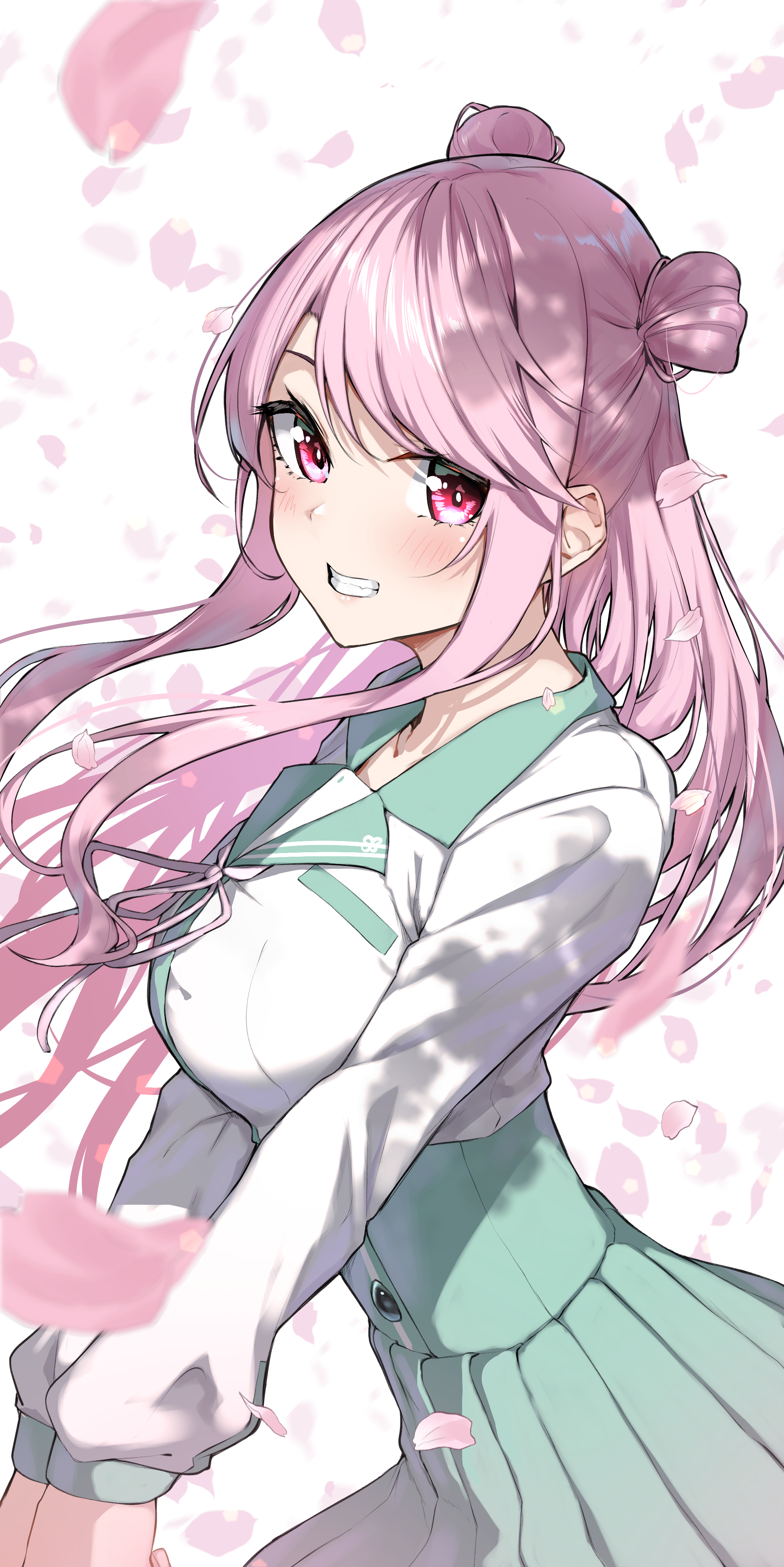 1girlaqua skirtbreastsfalling petalsgrinhigh-waist skirtlarge breastslong hairlong sleeveslooking at viewerneckerchiefpetalspink eyespink hairpink neckerchiefpink petalspleated skirtshirtskirtsmilesolowhite shirt