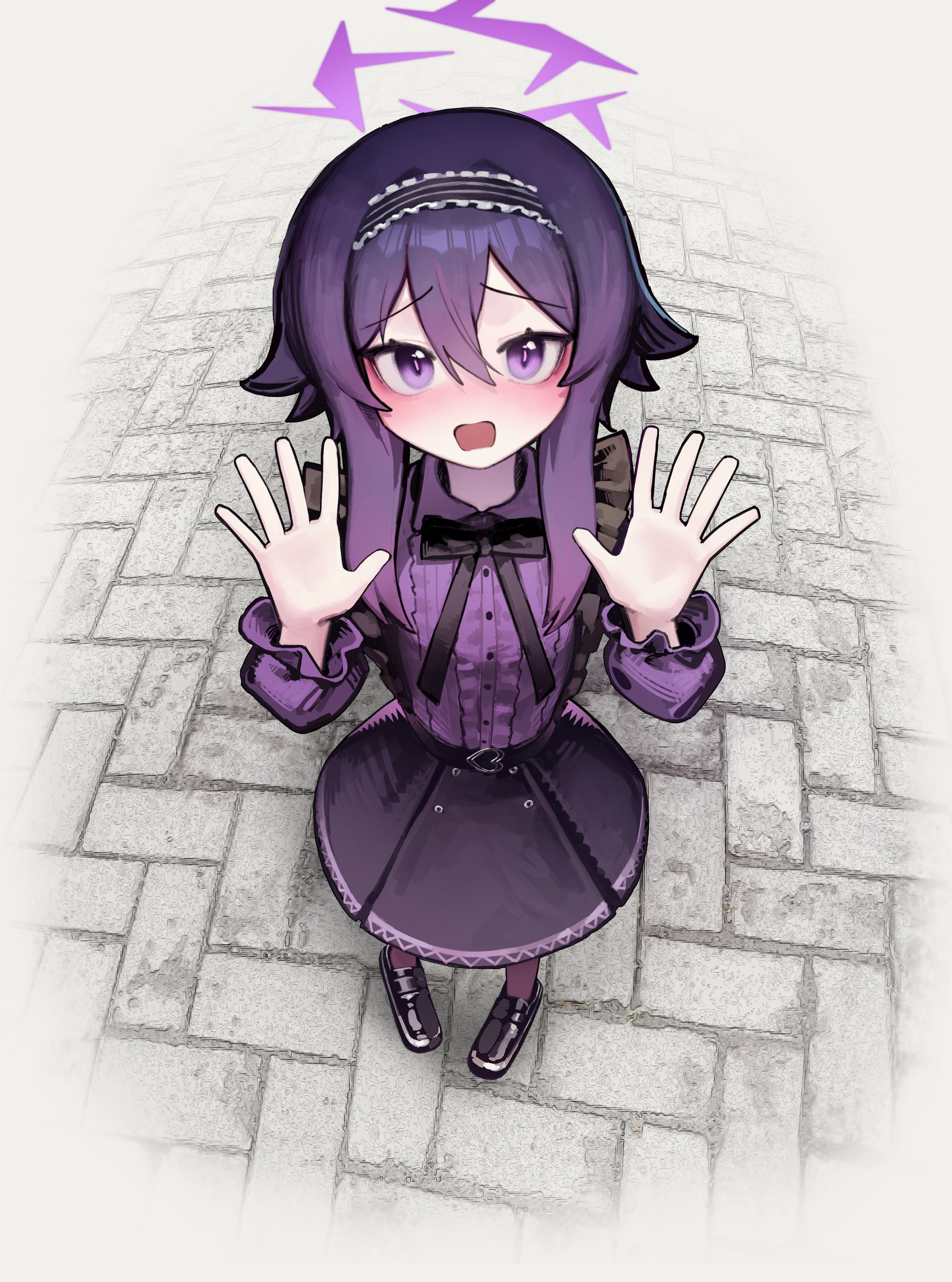 1girlblack bowblack bowtieblack hairbandblack shoesblushbowbowtiecollared shirthair between eyeshairbandhalololita hairbandlong sleeveslooking at vieweropen handsopen mouthpantyhosepurple eyespurple hairpurple pantyhosepurple shirtshirtshoesskirtsolo