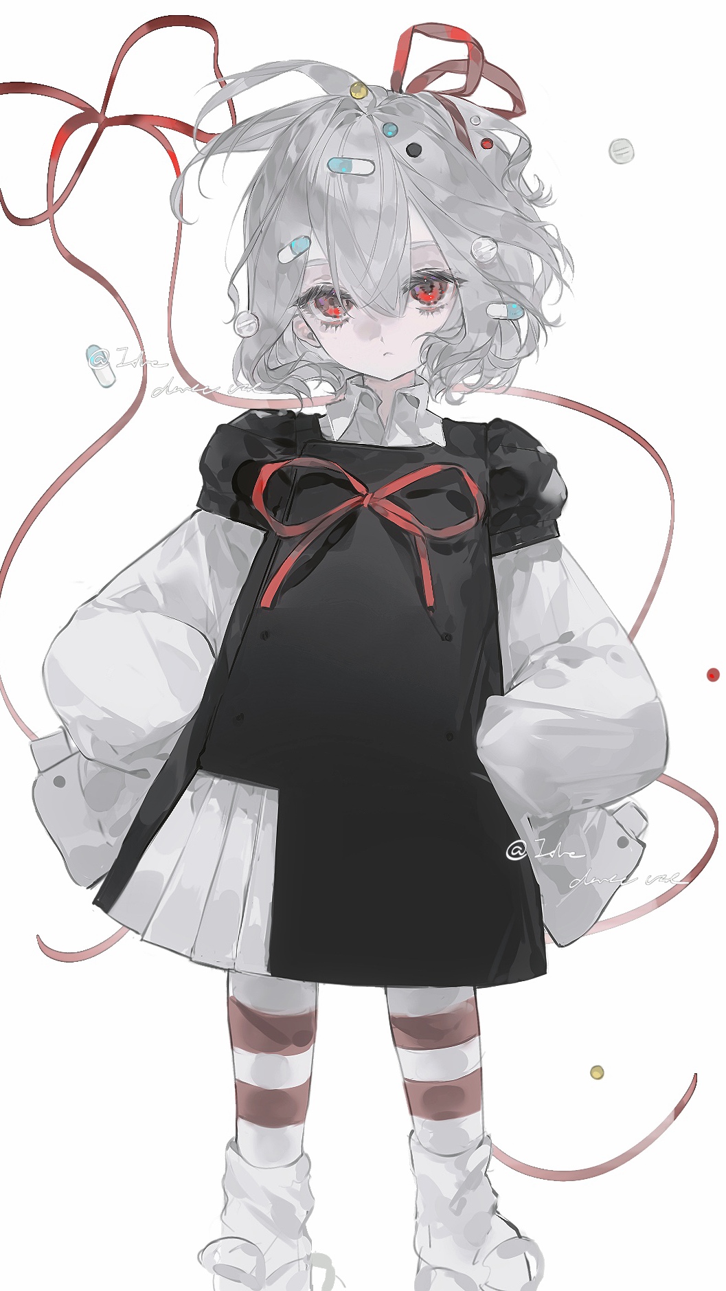 1girlblack dressdressfrillsgrey hairhair between eyeshair ornamenthair ribbonhand on own hipheilanshuimuchulong sleeveslooking at viewerneck ribbonpantyhosepillpuffy long sleevespuffy sleevesred eyesred ribbonribbonshort hairsimple backgroundsleeves past fingerssleeves past wristssolostandingstriped clothesstriped thighhighsthighhighswhite background