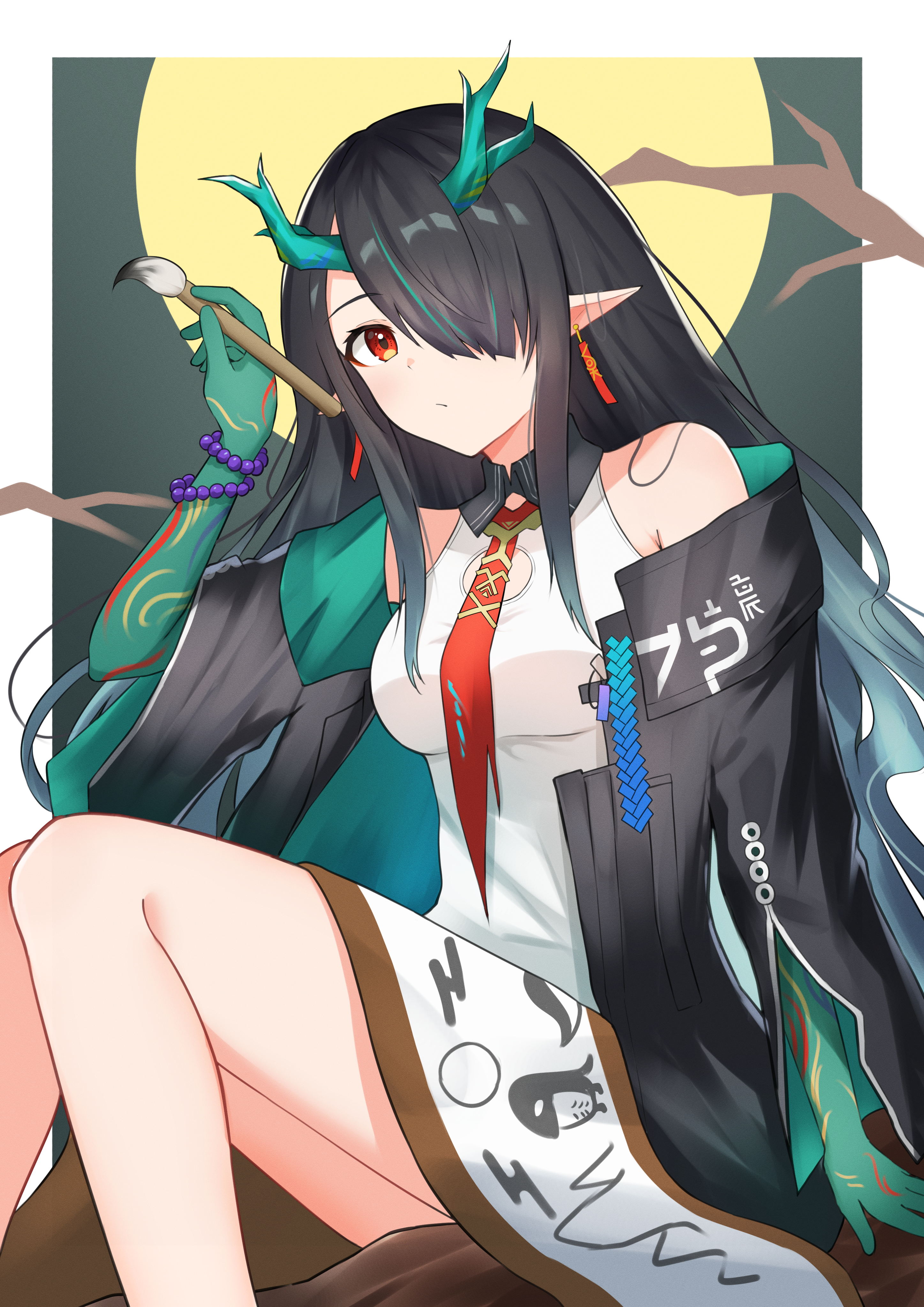 1girlblack hairblack jacketcalligraphy brushcolored extremitiescolored skindragon girldragon hornsdressearringsgradient skingreen handsgreen hornsgreen skinhair over one eyeholdingholding calligraphy brushholding paintbrushhornsjacketjewelrylong hairlooking at viewermulticolored hairnecktieopen clothesopen jacketpaintbrushpointy earsred eyesred necktiescrollsittingsleevelesssleeveless dresssolotasseltassel earringstwo-sided fabrictwo-sided jacketwhite dress