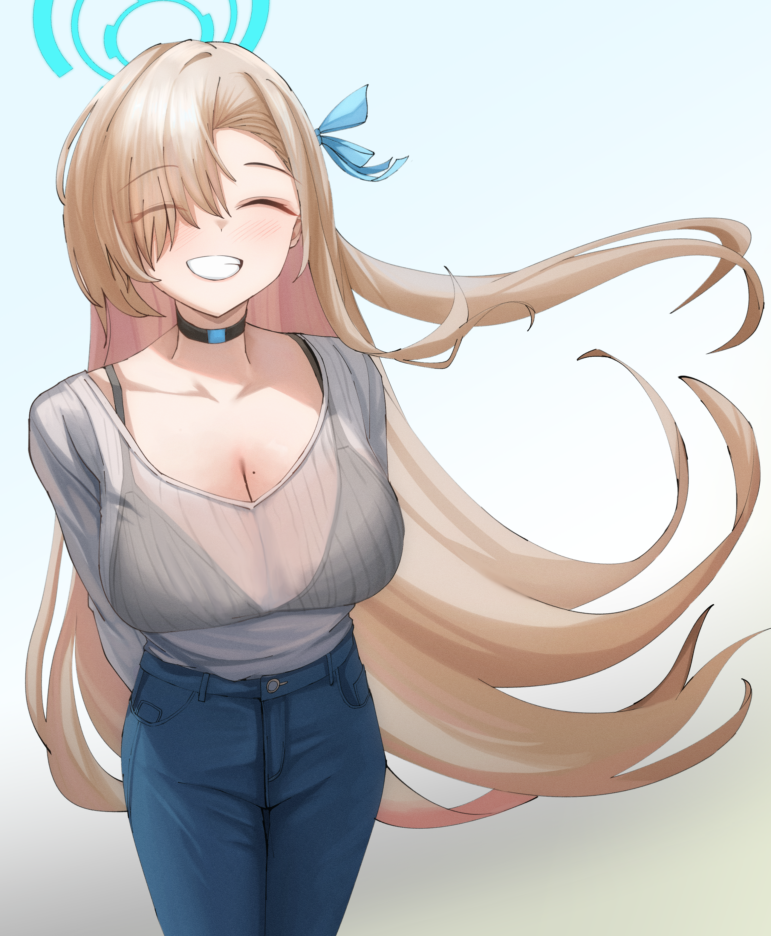 1boy1girlarms behind backasymmetrical bangsblack brablack chokerblonde hairbrabreastschokercleavageclosed eyescollarbonedenimeyes visible through hairfacing viewerfloating hairgrey shirtgrinhair over one eyehalojeanslong hairmolemole on breastpantsribbed shirtsee-through clothessee-through shirtshirtsimple backgroundsmilesolostraight hairunderwearvery long hairwhite background