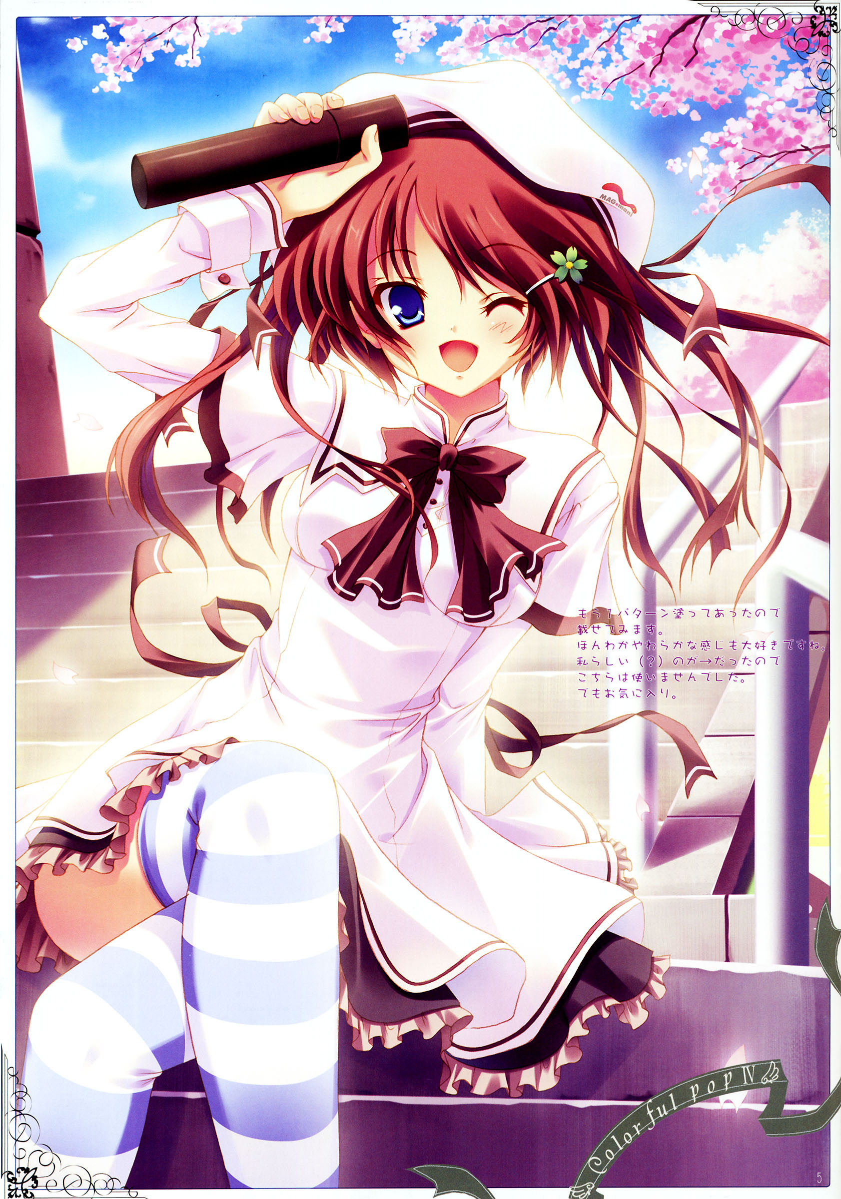 1girlblue eyescherry blossomsfemale focushair ornamenthairclipred hairschool uniformserafukusockssolostriped clothesstriped socksstriped thighhighsthighhighs