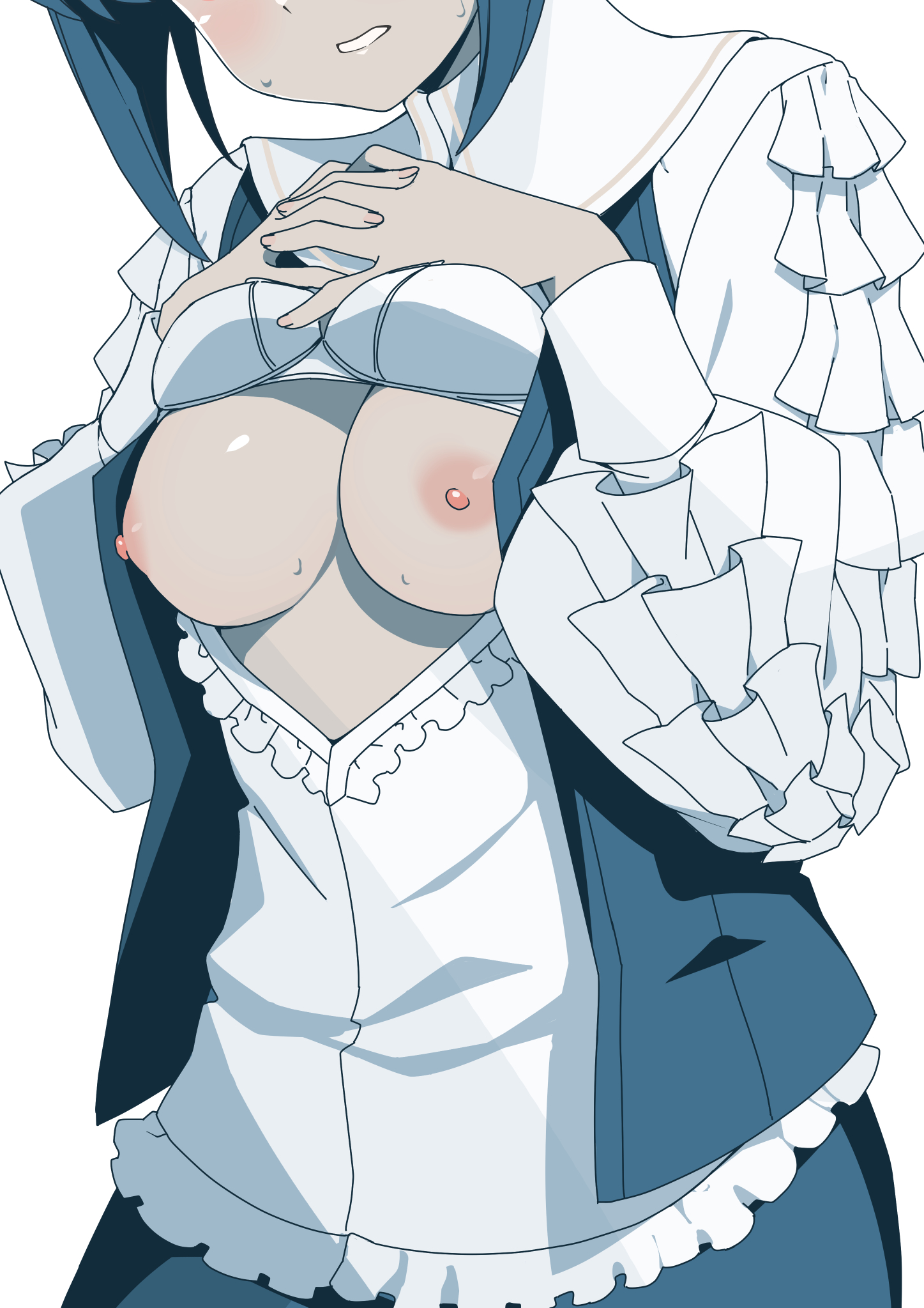 1girlblue hairblushbrabra liftbreastsbreasts outeyes out of framefingernailshead out of frameinterlocked fingerslong sleevesmedium breastsnipplesshirtshort hairsimple backgroundsolounderwearwhite backgroundwhite brawhite shirt