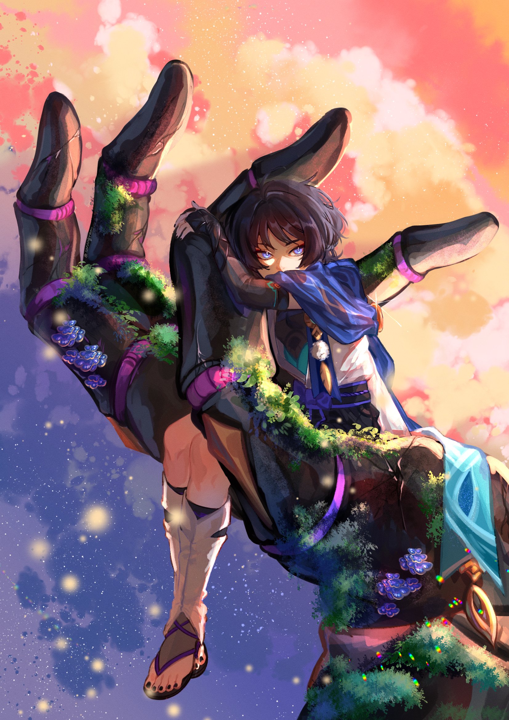 1boyarmorbeltblack beltblack bodysuitblack bridal gauntletsblack hairblack nailsblack sandalsblack shortsblue capeblue kimonoblunt endsbodysuitbowbridal gauntletscapecloudcloudy skyfurisodeglintgoldhand upjapanese armorjapanese clothesjubankimonokotekurokoteleg warmerslooking at viewermale focusmechanical handsmossopen clothesopen kimonoorange skyoutdoorspurple bowpurple eyespurple ropepurple sashpurple skyroperukkhashava mushroom (genshin impact)sandalssashshortssittingsitting on handskysolostar (sky)starry skytoeless legweartsurimewhite kimonowhite leg warmerswhite trimwispy bangszouri