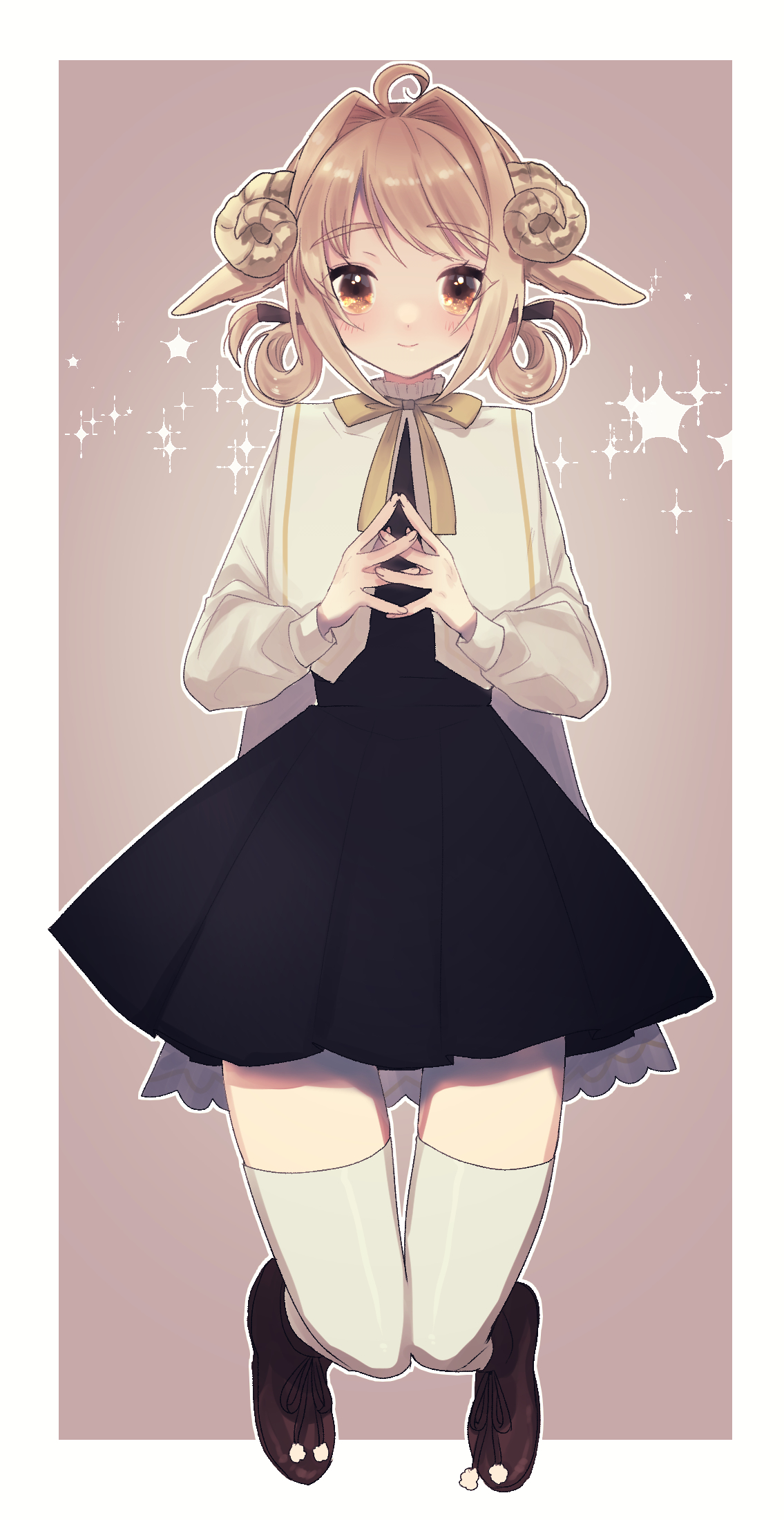 1girlahogeblack skirtborderbrown backgroundbrown eyesbrown hairbrown shoesclosed mouthcurled hornsfull bodyhornslong sleeveslooking at vieweroutside borderown hands togethershirtshoesshort hairskirtsmilesolostraight-onswept bangsthighhighswhite borderwhite shirtwhite thighhighs