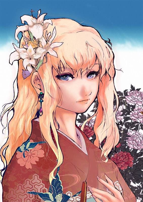 00sblonde hairblue eyesbugbutterflyearringsflowerhair flowerhair ornamentinsectjapanese clothesjewelrykimonolily (flower)long hairpeony (flower)solo