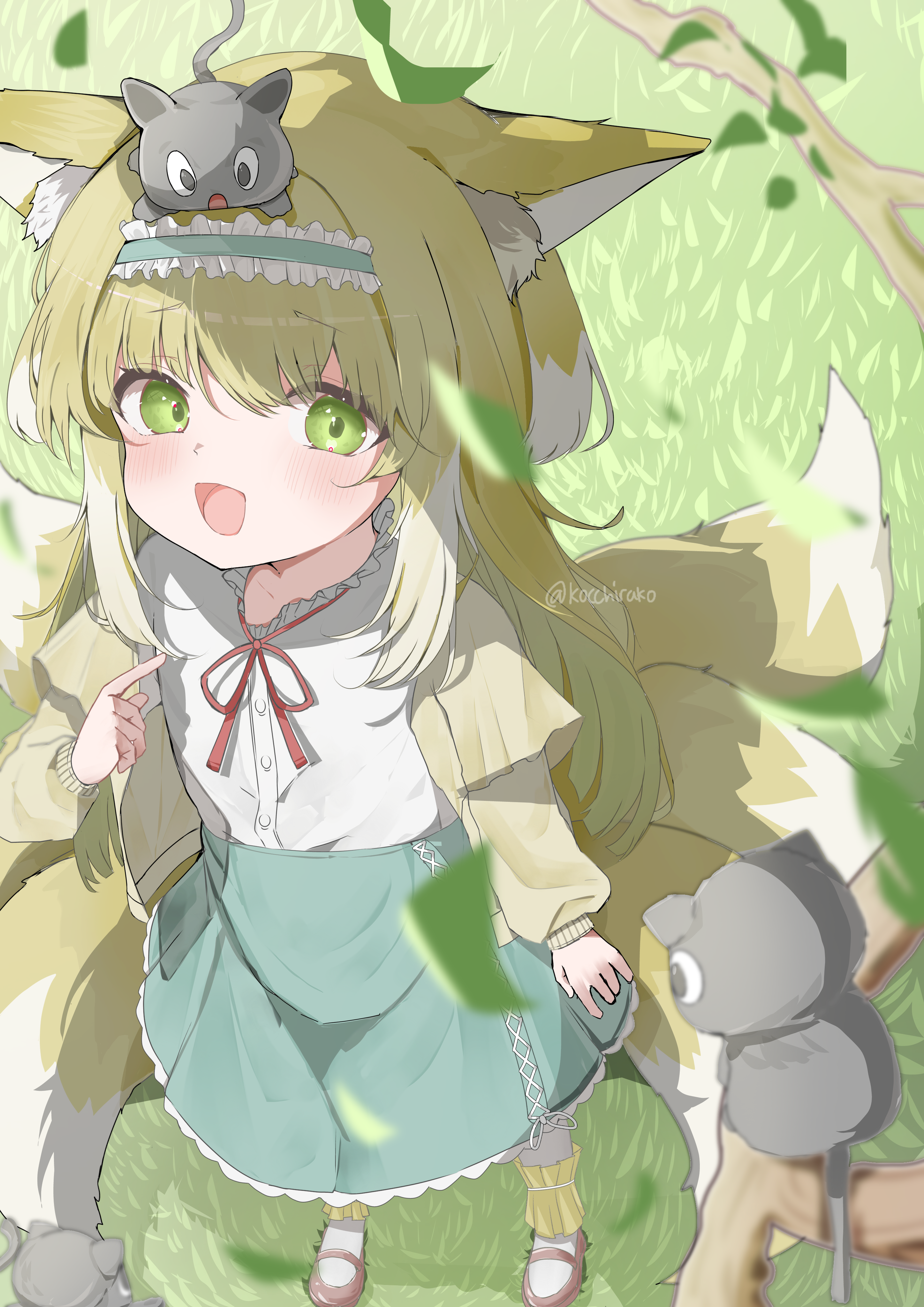 1girlanimal earsblack catblonde haircatfox earsfox girlfox tailfrilled hairbandfrillsgreen eyeshairbandkitsunelong hairlong sleevesmultiple tailsneck ribbonofficial alternate costumered ribbonribbonshirtskirttailwhite shirt