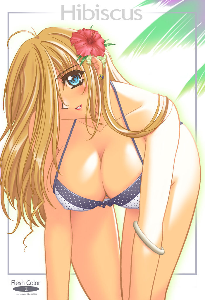 bikiniblonde hairblue eyesblushbreastscleavageearringsflowerhair ornamenthuge breastsjewelrylong hairsmileswimsuit