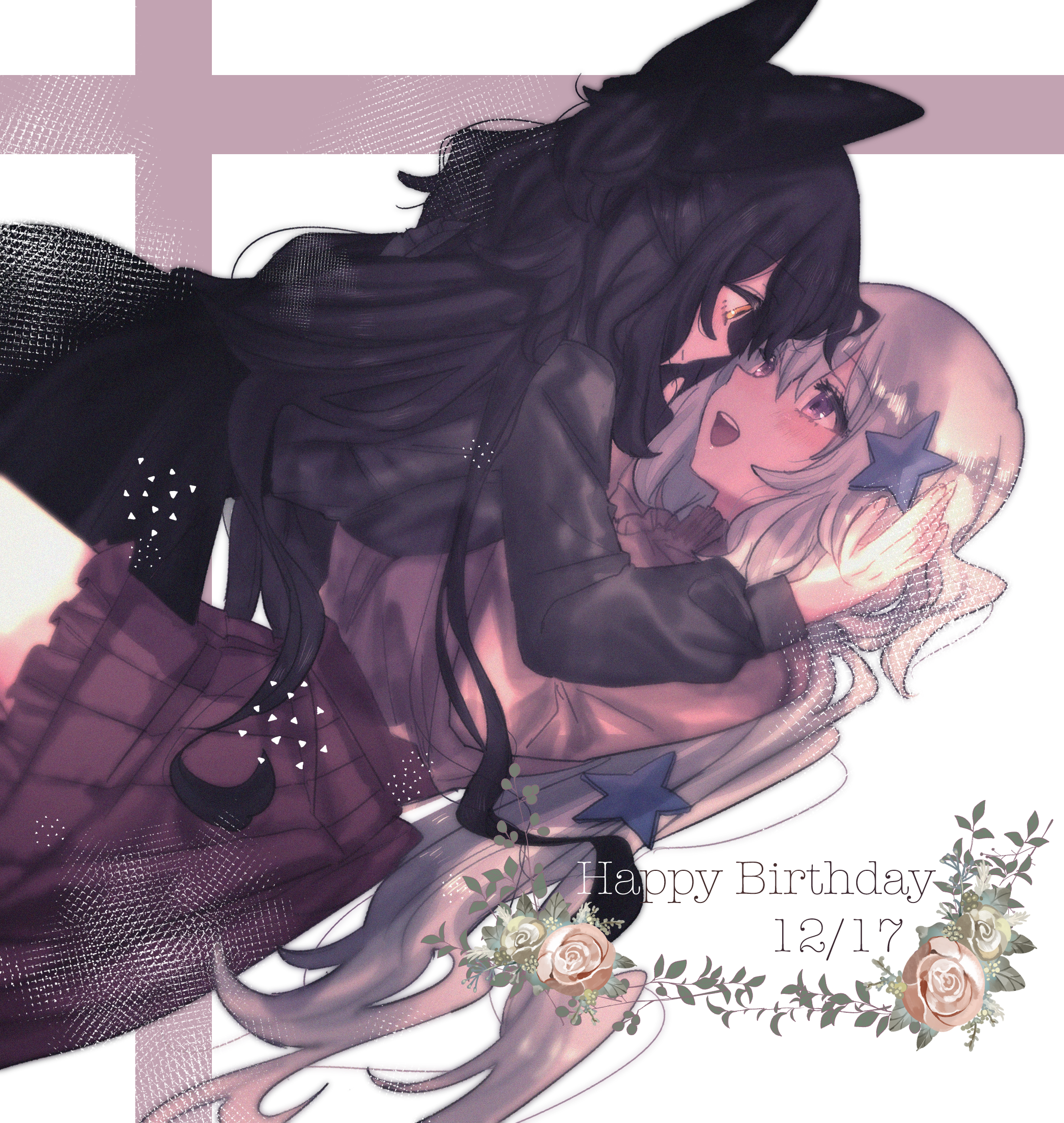 2girlsblack bowblack hairblack shirtblack skirtboweye contactgrey hairhair bowhair ornamenthappy birthdaylong hairlong sleeveslooking at anotherlyingmultiple girlson backopen mouthpink shirtpurple eyespurple skirtshirtskirtsmilestar (symbol)star hair ornamentyellow eyesyuri
