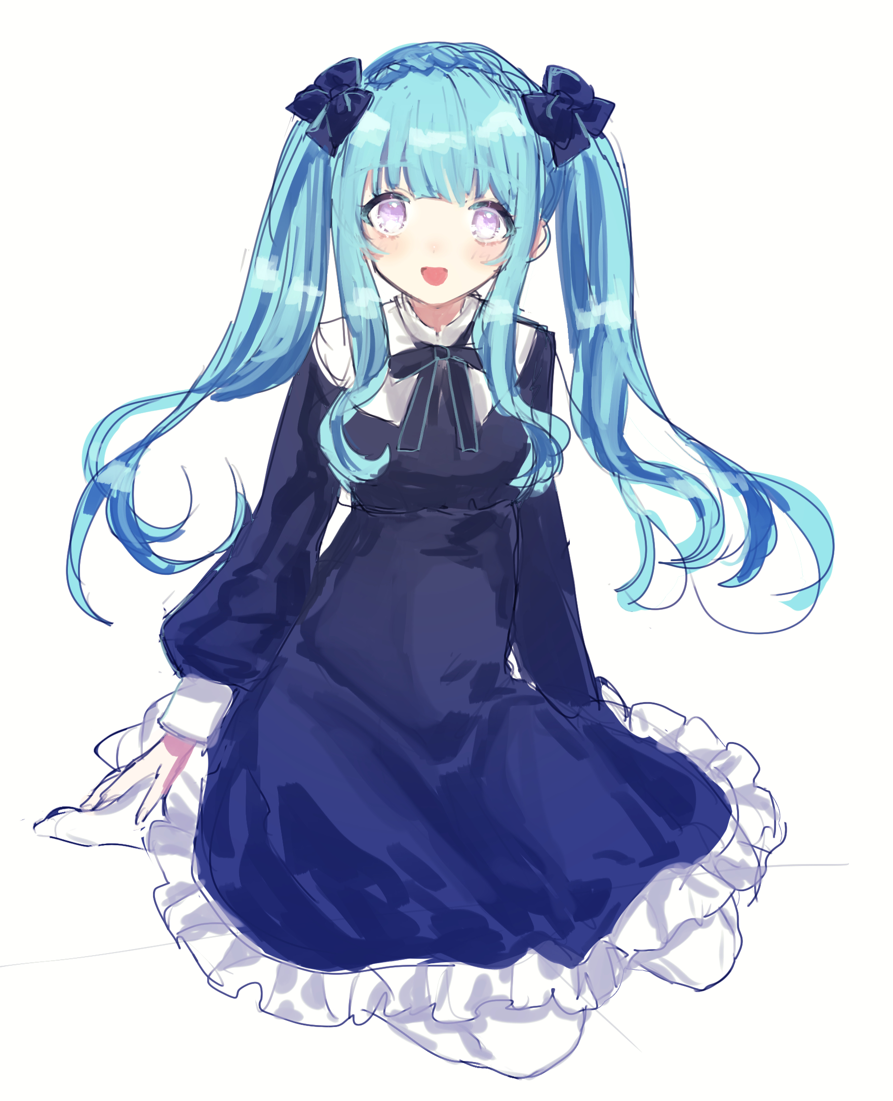 :d1girlblack bowblack dressblack ribbonblue hairbowdressfrilled dressfrillsfull bodyhair bowlong hairlong sleeveslooking at viewerneck ribbonopen mouthpurple eyesribbonsidelockssimple backgroundsittingsketchsmilesolotwintailswhite background