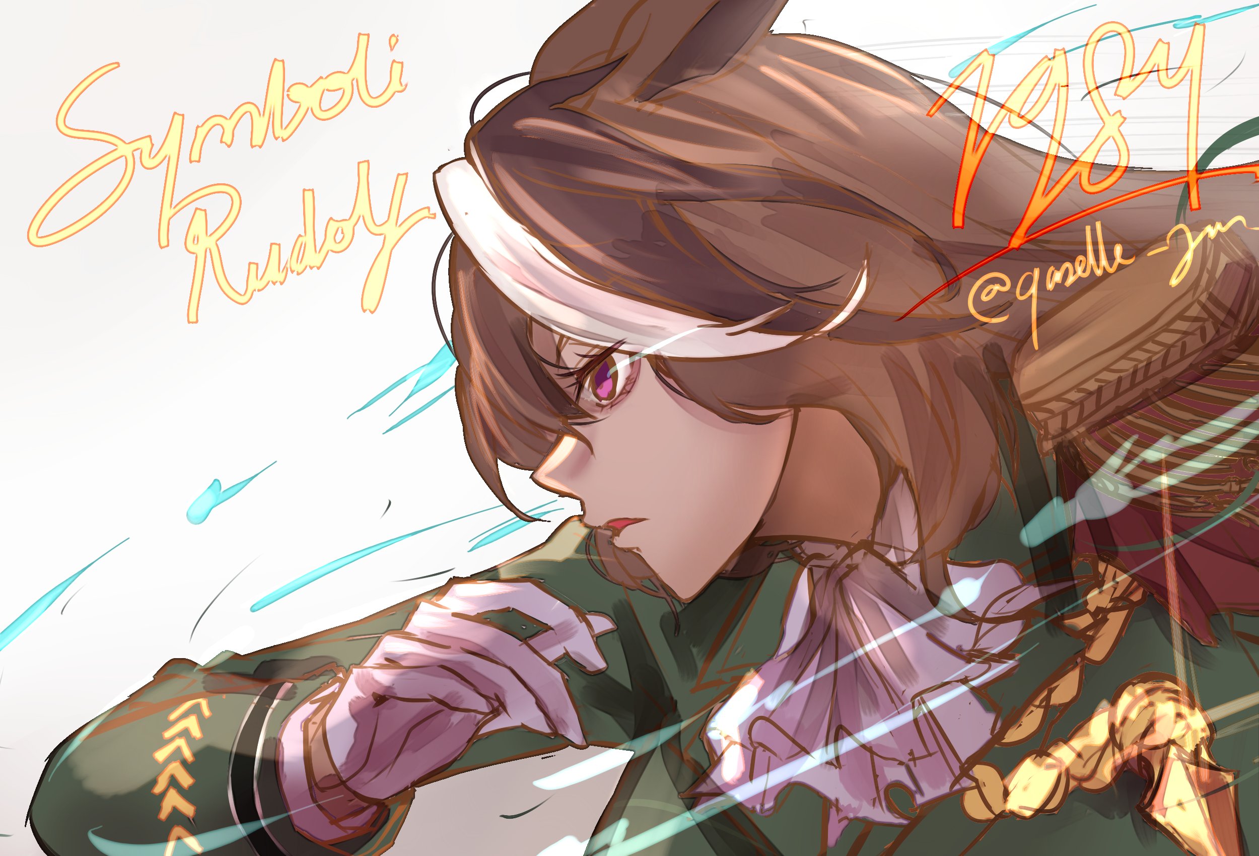 1girlaiguilletteanimal earsascotbrown hairepaulettesglovesgreen jackethair between eyeshorse earshorse girljacketlong hairlong sleevesmulticolored hairopen mouthpurple eyessingle epaulettestreaked hairupper bodywhite ascotwhite gloveswhite hair