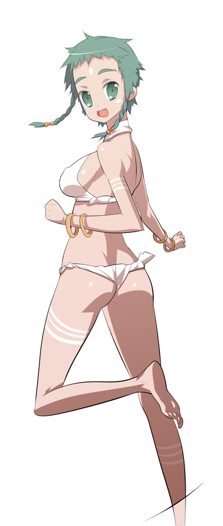 1girlassbackbarefootbraidbreastsfeetfemale focusgreen eyesgreen hairmatching hair/eyesmedium breastssideboobsolessolotwin braidswristband