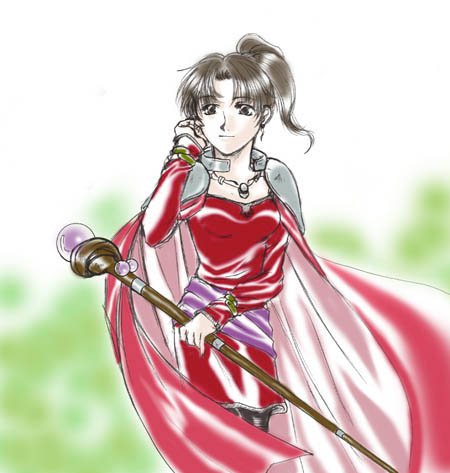 1girlblushbrown eyesbrown hairdressfemale focusholdingjewelrylong sleeveslooking to the sidenecklacependantponytailred dressrodshort hairsolostaff