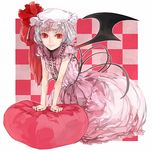 1girlarm supportbordercheckered backgrounddressfemale focushatlooking at viewermob cappillowpink dresspuffy short sleevespuffy sleevesred eyesshort sleevessimple backgroundsolo