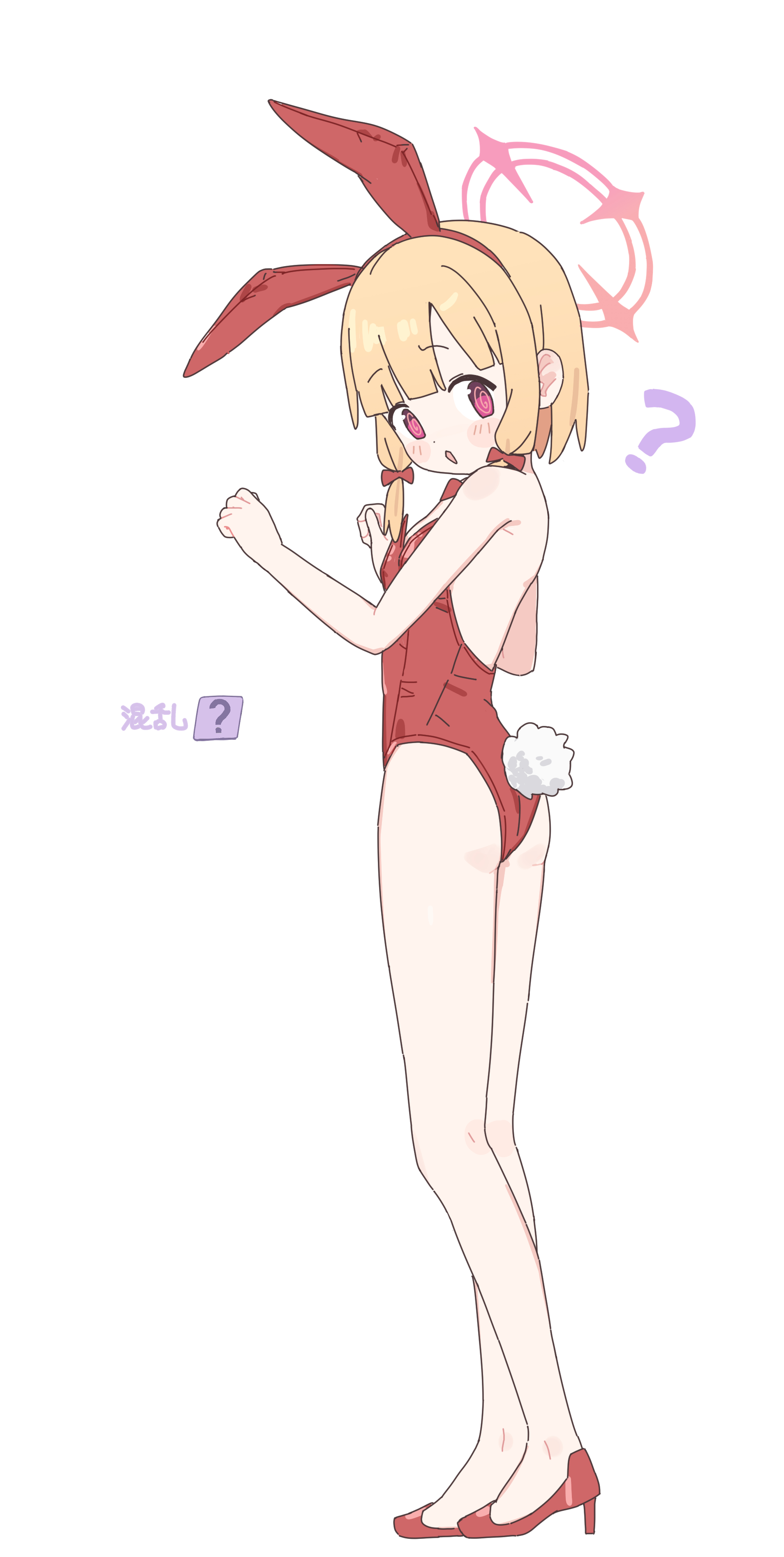1boy1girlanimal earsassbare legsbare shouldersblonde hairblushdetached collarfake animal earsfake tailfrom sidefull bodyhalohigh heelsleotardlooking at viewerlow-tied sidelocksnecktieopen mouthpink haloplayboy bunnyrabbit earsrabbit tailred eyesred leotardred necktiered shoesshoesshort hairsidelockssideways glancesimple backgroundsolostandingstraplessstrapless leotardtailwhite background
