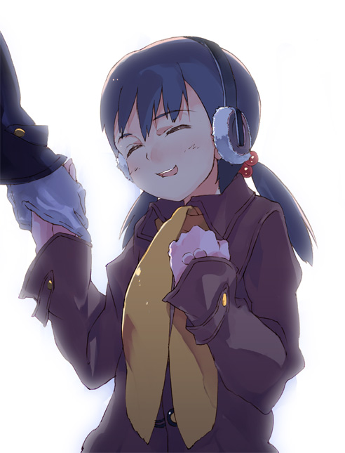 1girlblack hairearmuffsfemale focusholding handsoutdoorsscarfsimple backgroundsolostandingtwintailswhite background