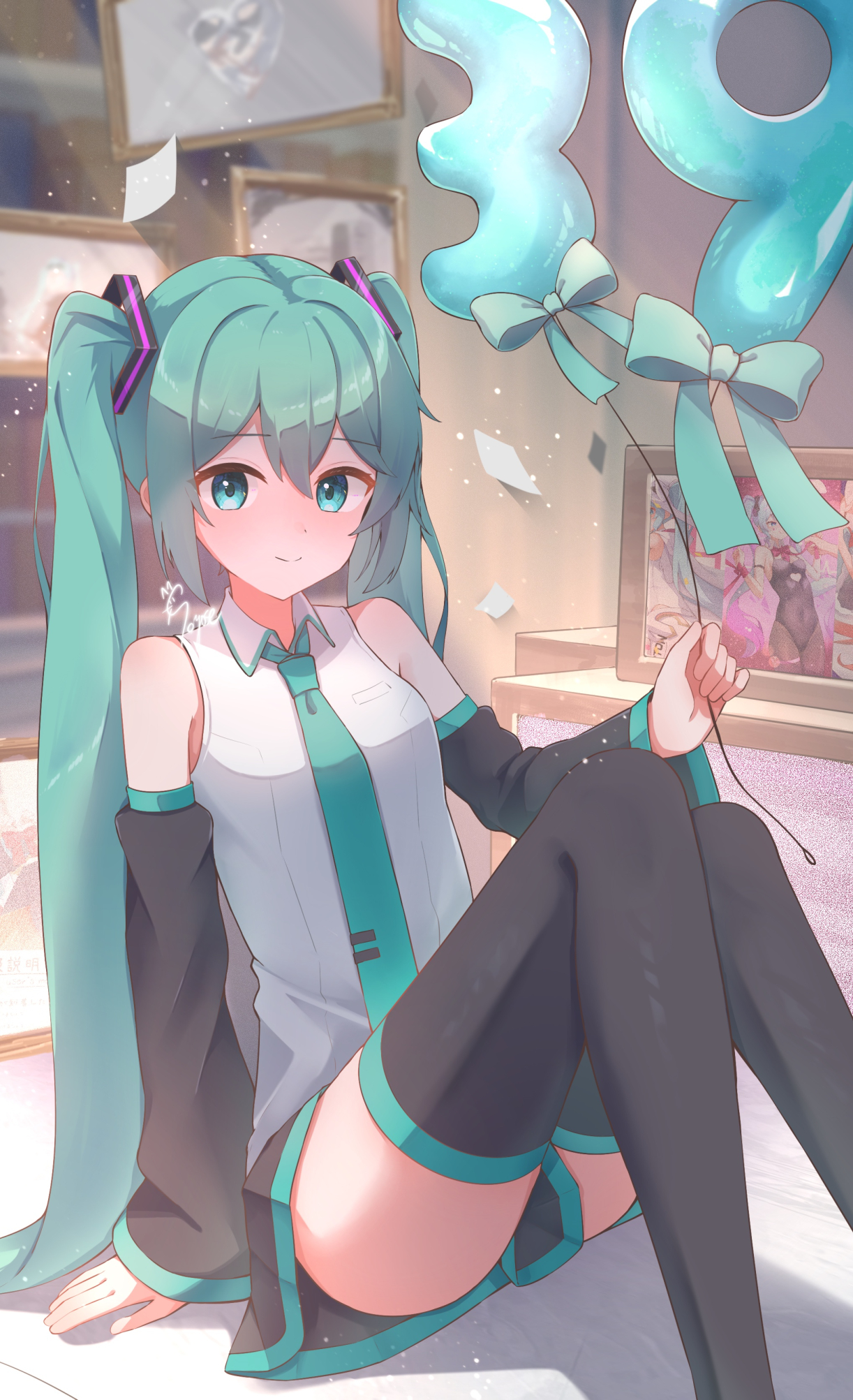 1girlaqua bowaqua eyesaqua hairaqua necktieaqua trimballoonblack skirtbootsbowclosed mouthcollared shirtdetached sleeveshair between eyeshair ornamentholdingholding balloonlight blushlong hairlong sleeveslooking at viewermiku daynecktienumber balloonpleated skirtshirtsittingskirtsleevelesssleeveless shirtsmilesolothigh bootstwintailsvery long hairwhite shirt