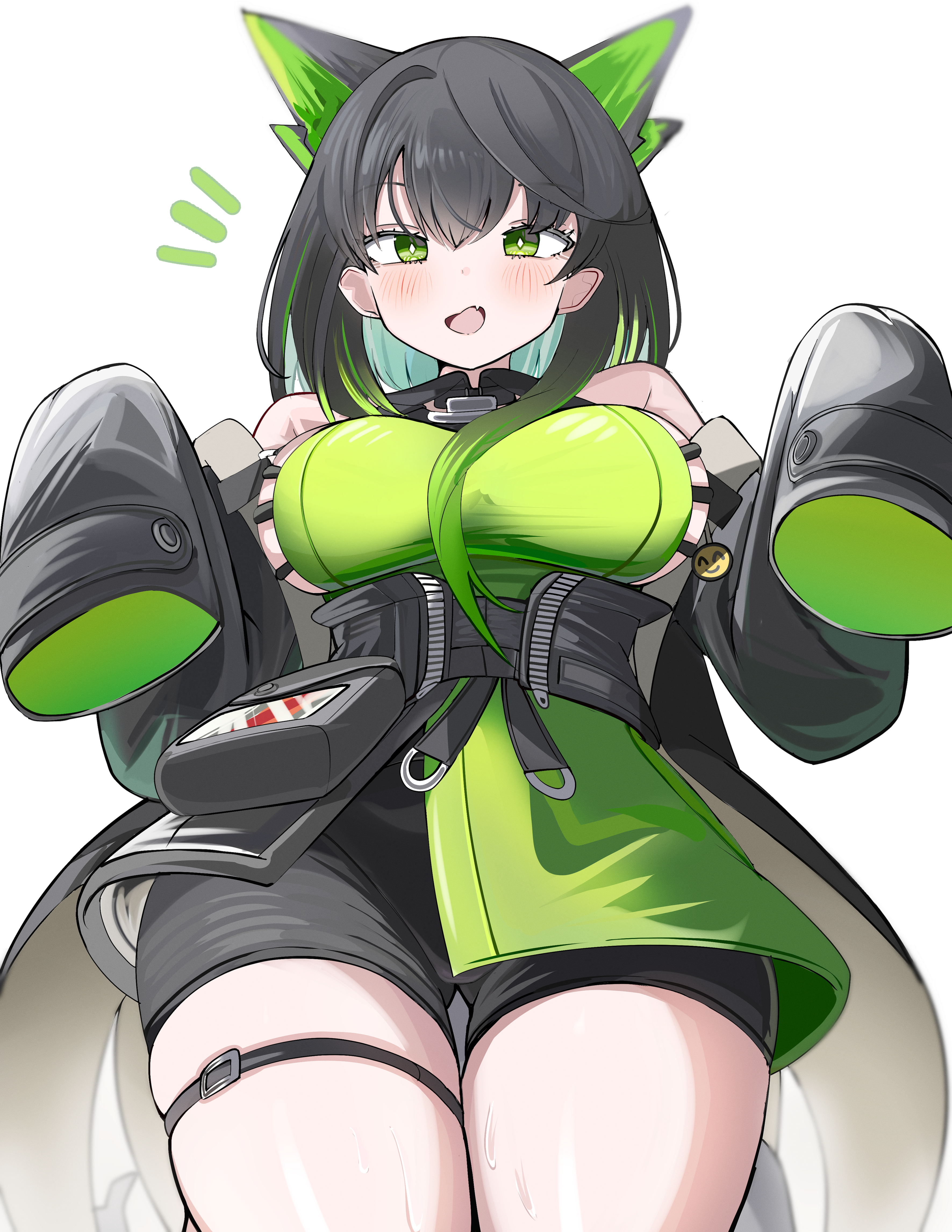 1girlbare shouldersbeltblack hairblack jacketblack shortsblushbreastscowboy shotdressfangfrom belowgreen dressgreen eyesgreen jacketgreen streakshair between eyesjacketlarge breastslong hairlong sleeveslooking at viewermulticolored hairnotice linesoff shoulderopen mouthshort dressshort shortsshortsshorts under dresssideboobsimple backgroundskin fangskindentationsleeves past fingerssleeves past wristssolostandingstethoscopestethoscope around neckstreaked hairthick thighsthigh beltthigh gapthigh strapthighstight clothestwo-sided fabrictwo-sided jacketunderbustwhite background