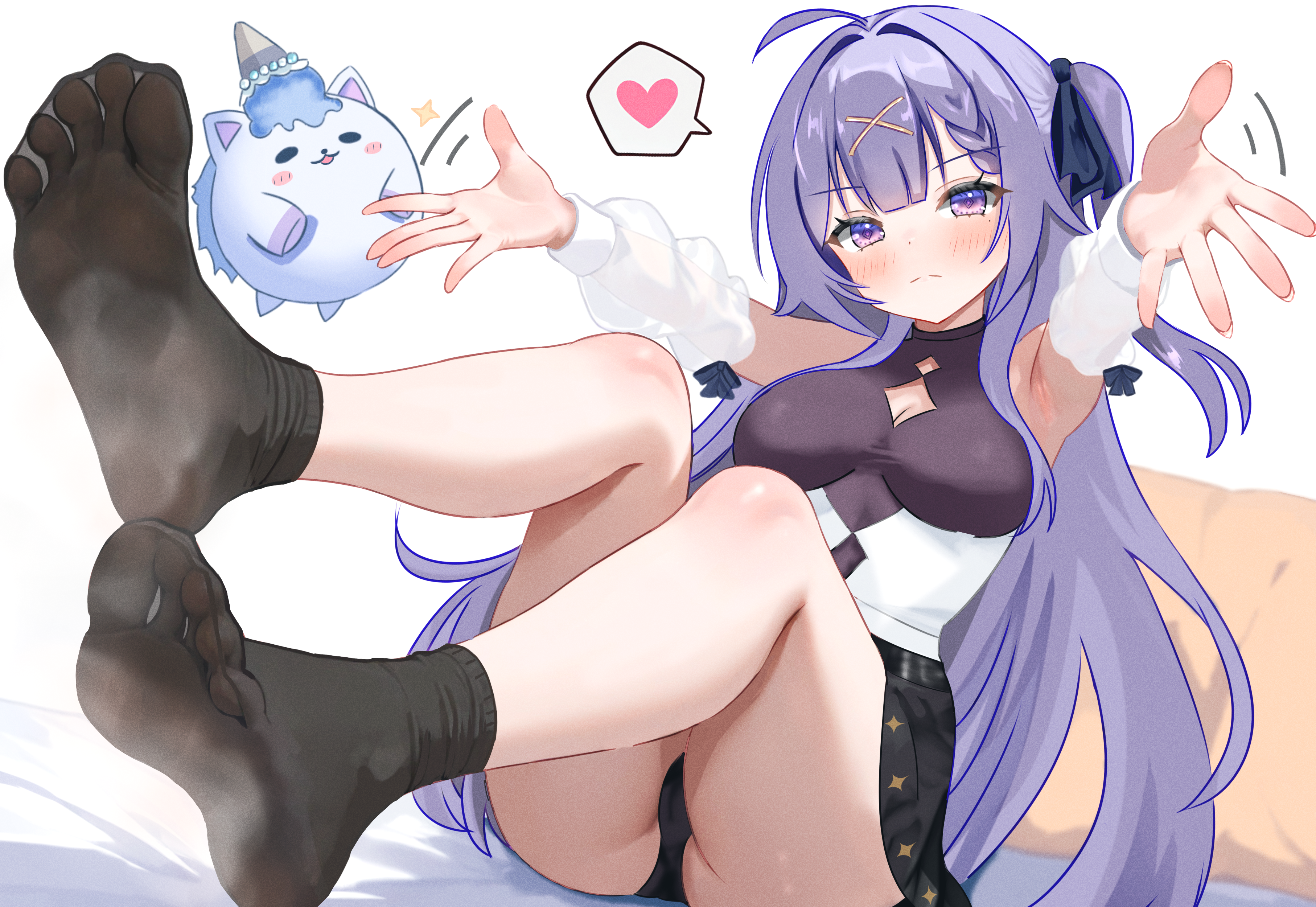 1girlblack pantiesblack socksblushfeetlong hairlooking at viewerpantiespantyshotpurple eyespurple hairsee-through clothessee-through legwearside ponytailsockssolessteamtoesunderwear