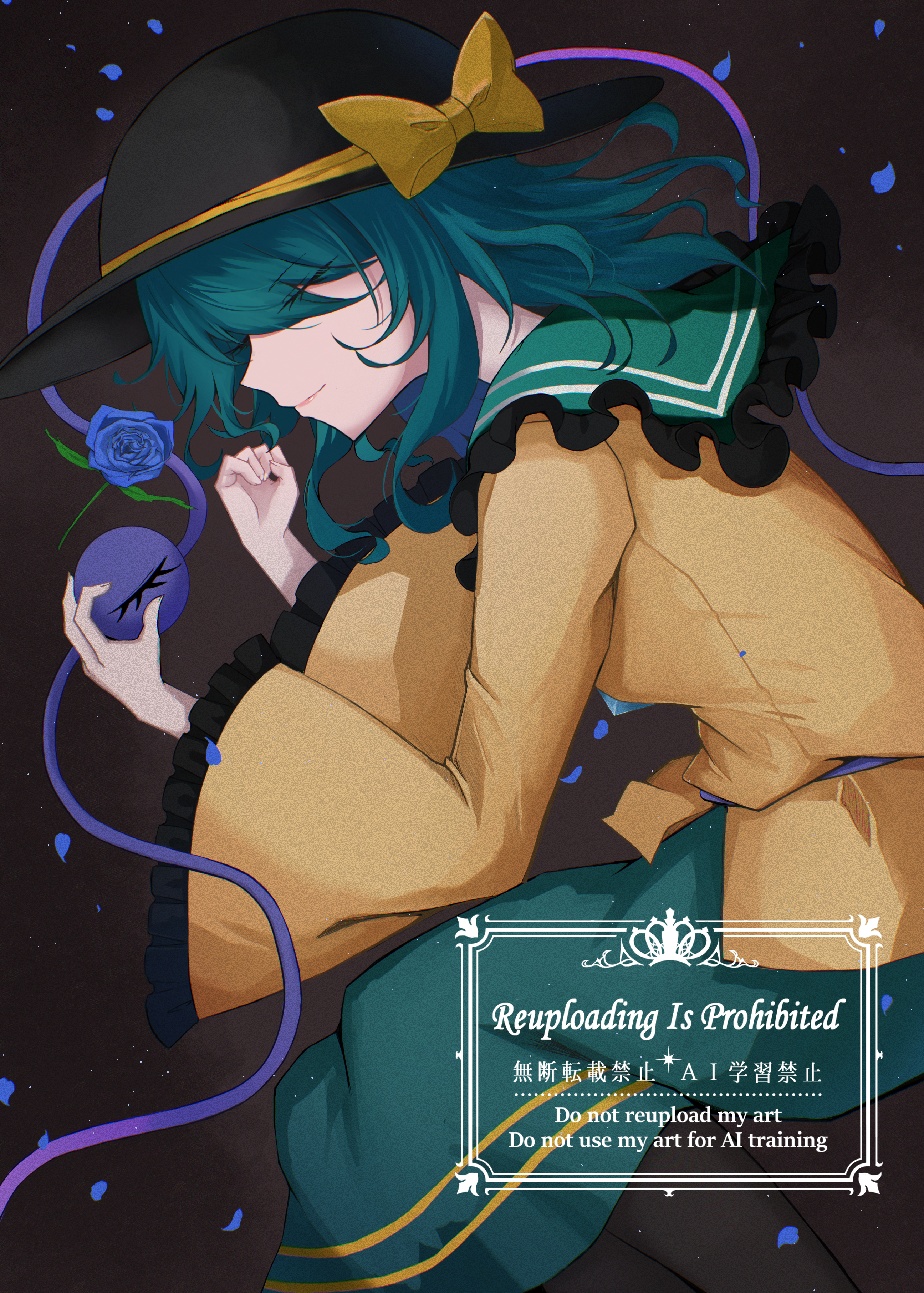 1girlblack hatblue flowerblue petalsblue rosebowcollarflowerfrilled collarfrilled sleevesfrillsfrom sidegreen collargreen skirthair over eyeshathat bowlyingmedium hairon sideprofileroseshirtskirtsolothird eyewide sleevesyellow bowyellow shirt