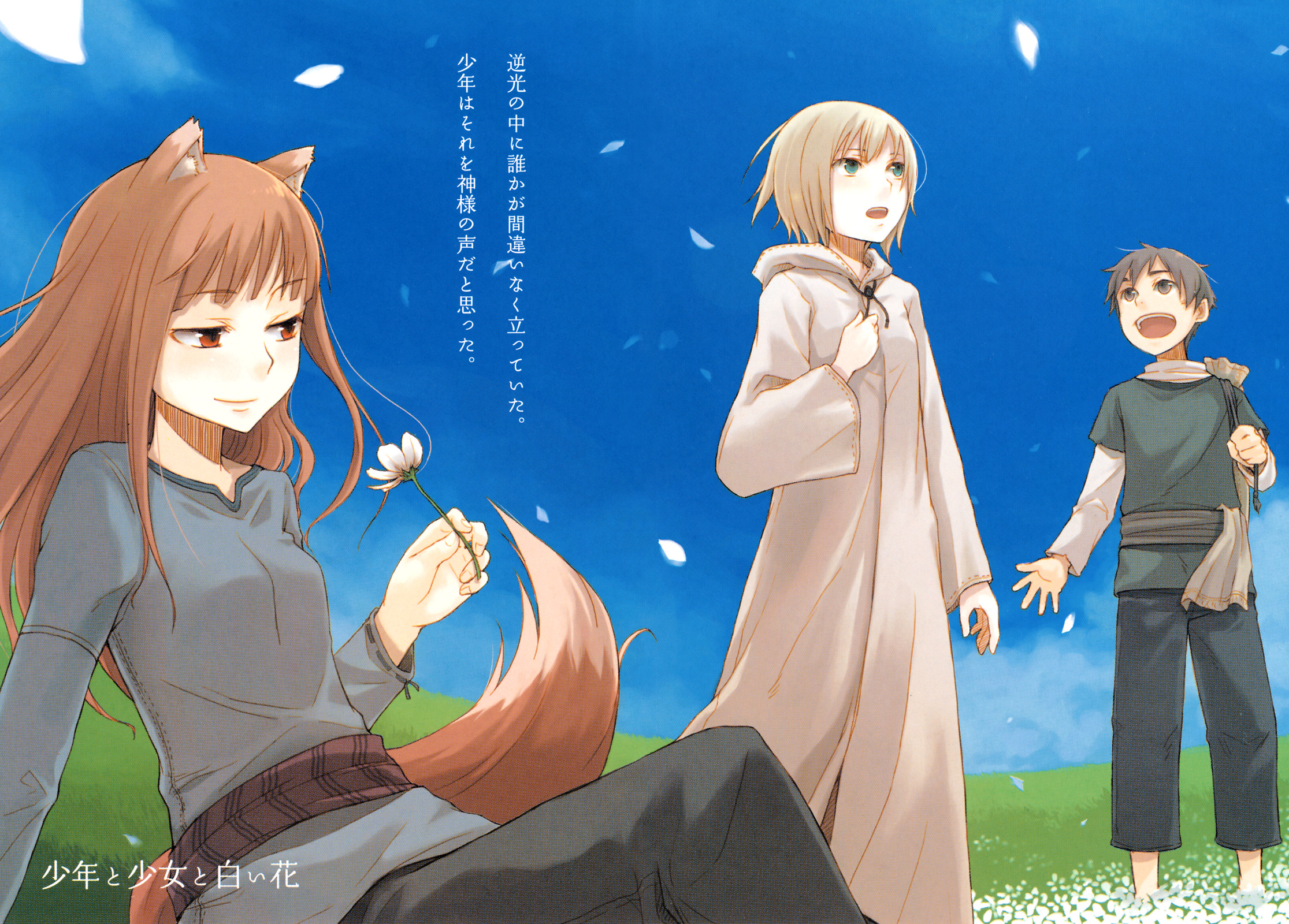 00s1boy2girlsanimal earsbrown hairdayflowerlong hairmultiple girlsred eyesrobesittingskytailwolf earswolf tail