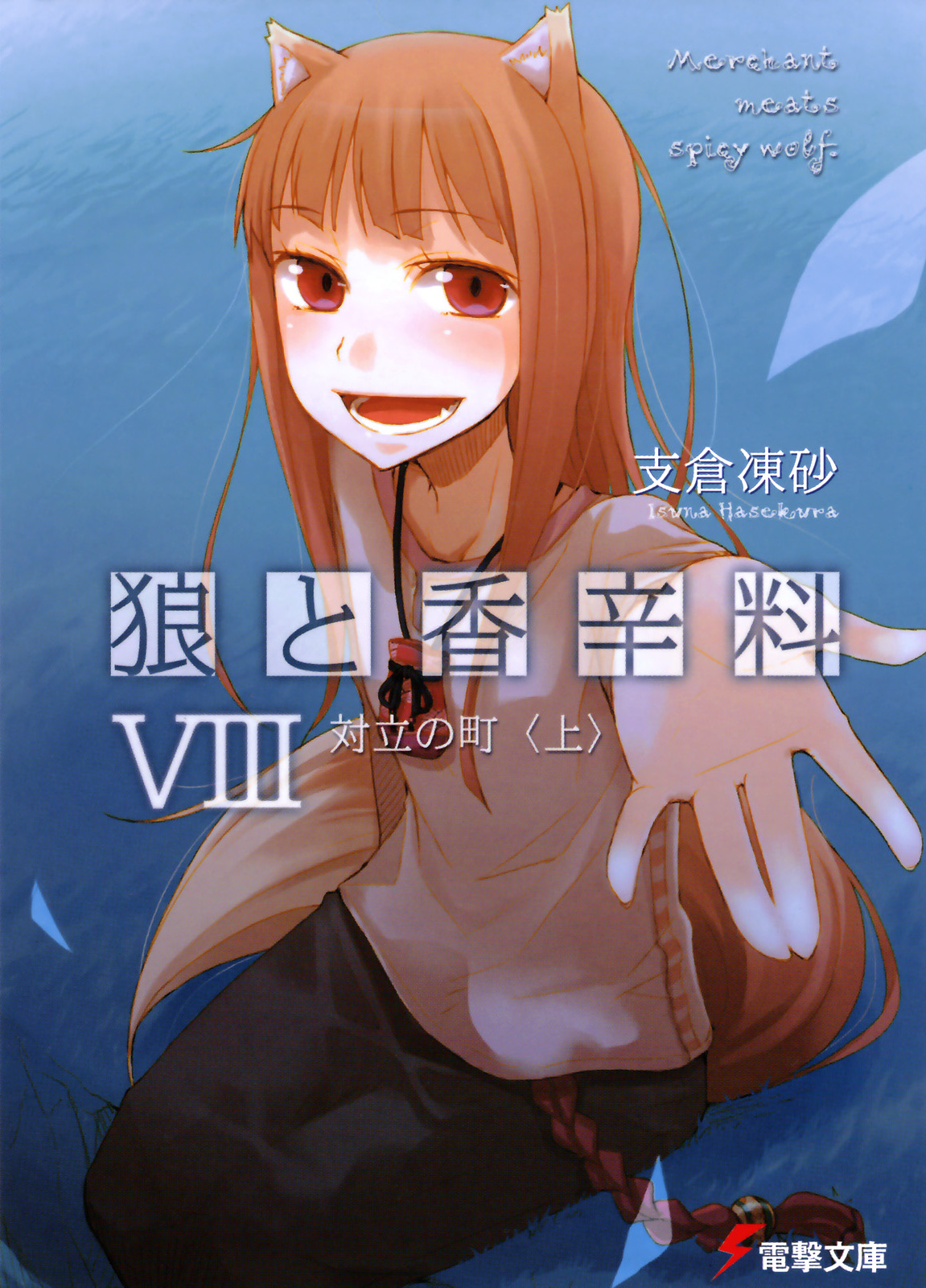 :d00s1girlanimal earsbagblunt bangsblushbreastsbrown haircompany namecopyright namecovercover pageenglish textengrish textfemale focusforeshorteningfrom sidehappyjewelrylightning bolt symbollogolong hairlong sleevesnecklacenovel coveropen mouthoutstretched armranguagered eyessidelockssittingsmall breastssmilesolotailtransparentwolf earswolf tail