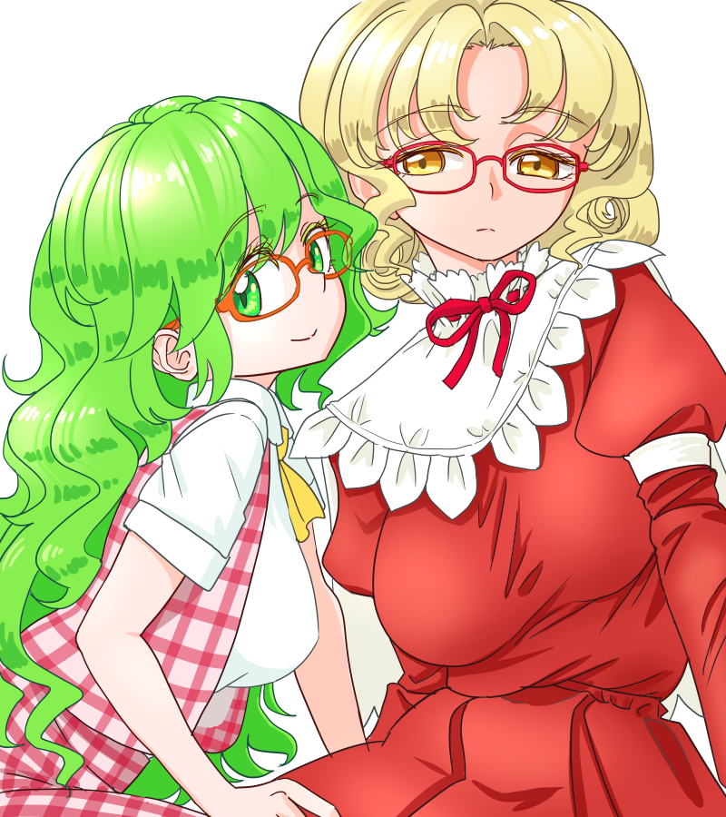 2girlsascotblonde hairbreastscapeletcurly haircurtained hairfrilled capeletfrillsglassesgreen eyesgreen hairjacketlong hairlong sleevesmultiple girlsneck ribbonorange-tinted eyewearplaid clothesplaid jacketplaid skirtred ribbonred shirtred skirtred-tinted eyewearribbonshirtshort sleevesskirtsmiletinted eyewearwhite capeletwhite shirtyellow ascotyellow eyes