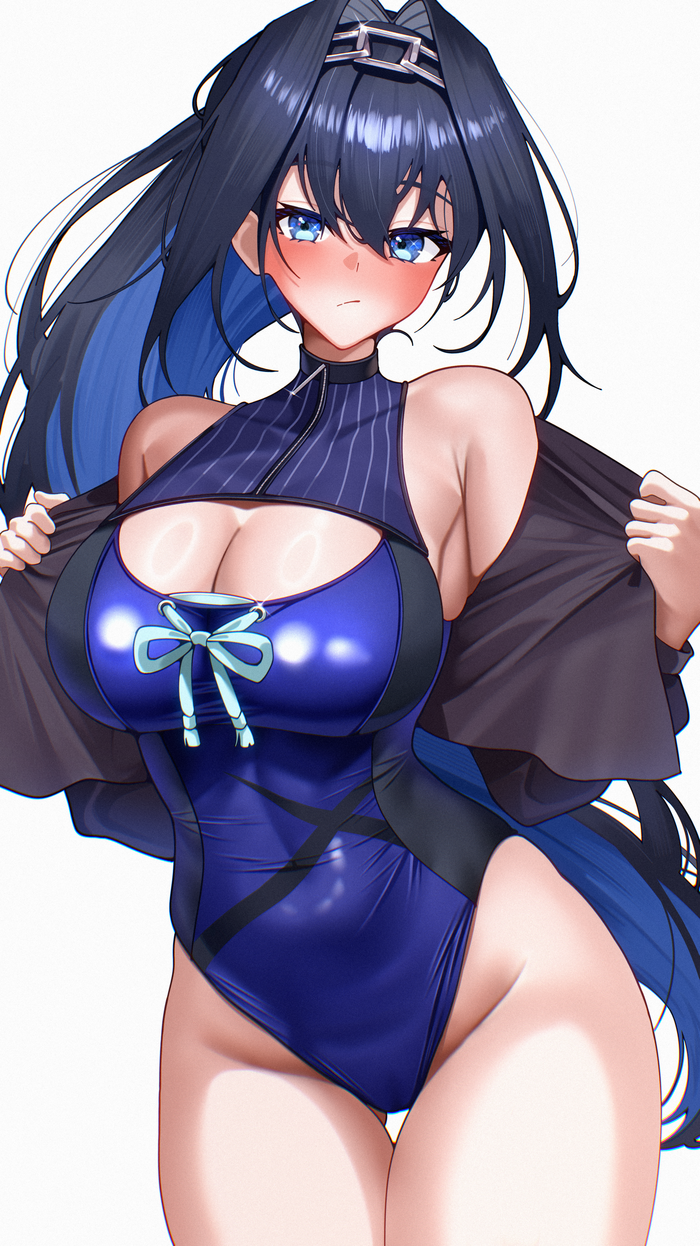 1girlblue eyesblue hairblue one-piece swimsuitblushbreastscleavagegluteal foldlarge breastslong hairlooking at viewerone-piece swimsuitsimple backgroundsoloswimsuitthighsvirtual youtuberwhite background