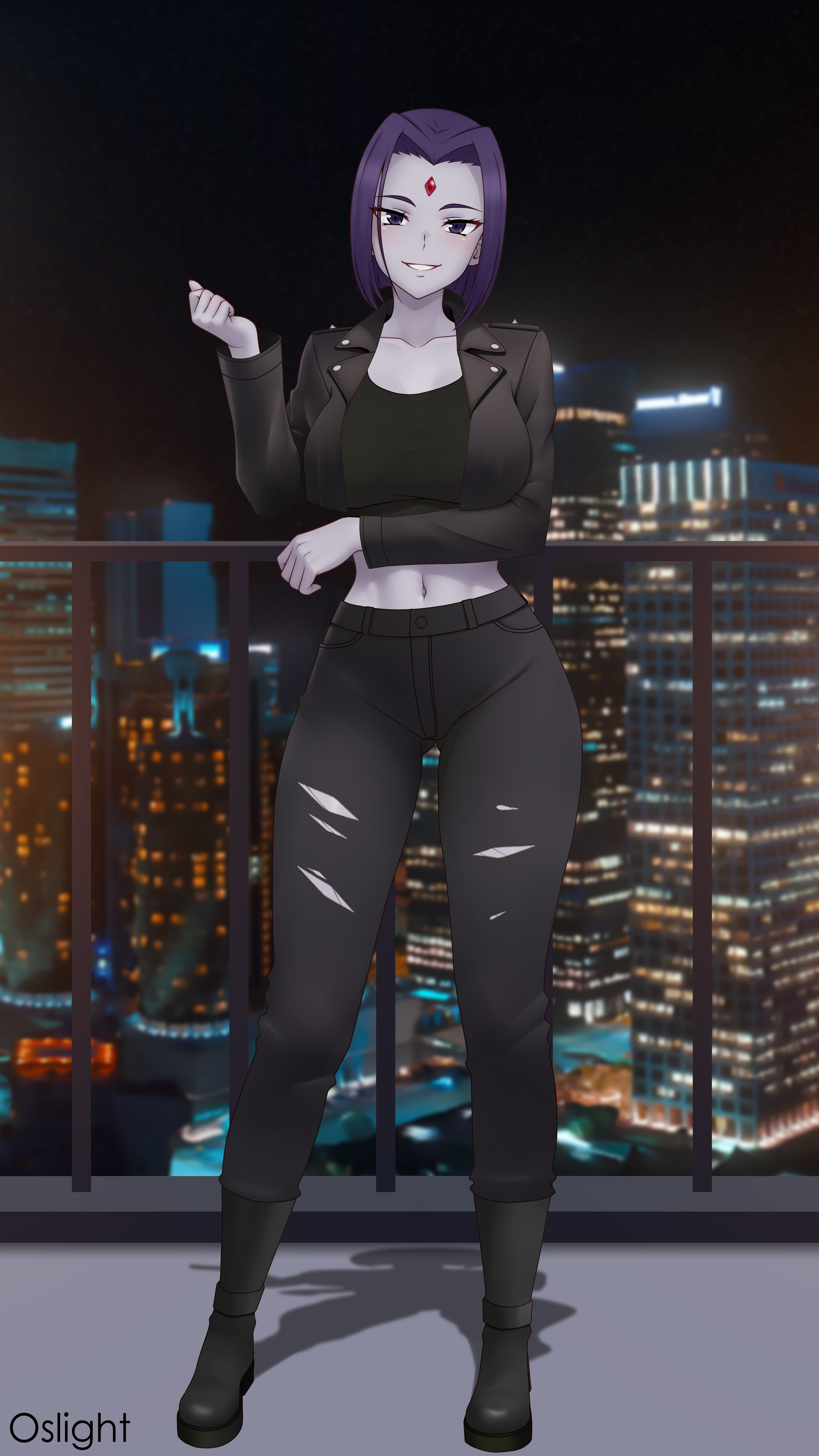 1girlalternate costumeartist namebootsbreastscollarbonecolored skindenimforehead jewelfull bodygrey skinjacketjeanslooking at viewermedium breastsnavelopen clothesopen jacketpantspurple eyespurple hairshort hairsolostandingtorn clothestorn jeanstorn pants