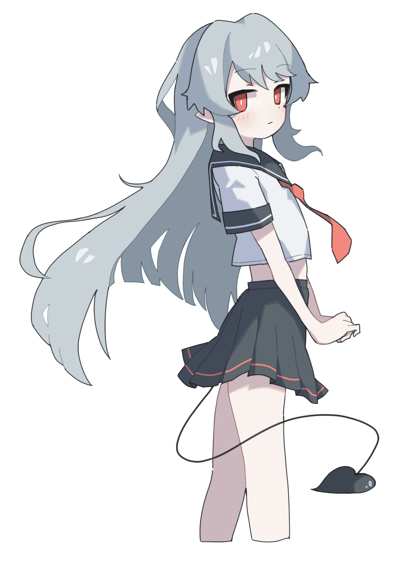 1boy1girlblack sailor collarblack skirtbright pupilsclosed mouthcropped shirtdemon taildot noseexpressionlessfeet out of frameflat chestfrom sidegrey hairlight blushlong hairlooking at viewermidriff peekminiskirtnecktieown hands togetherpleated skirtpointy earsred eyesred necktiesailor collarschool uniformserafukushirtshort sleevessidelockssimple backgroundskirtsolostraight hairtailtetetacousamimi kuroi (tetetaco)very long hairwhite backgroundwhite serafukuwhite shirtwide sleeves