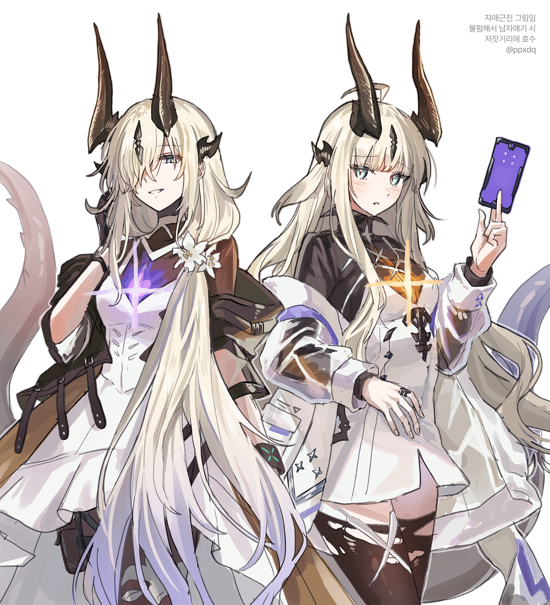2girlsahogebetween fingersblack glovesblack jacketblack shirtblonde hairblushbodystockingbrown hornsbrown thighhighscowboy shotdressfingernailsflowerglovesgradient hairgreen eyesgrinhair flowerhair ornamenthair over one eyehand in own hairholdinghornsjacketjewelrylong hairlong sleeveslooking at viewermulticolored hairmultiple girlsoff shoulderone eye coveredparted lipspurple hairringshirtsiblingssimple backgroundsisterssmilesmugstandingsweatdroptailtail raisedthighhighstorn clothestorn thighhighswhite backgroundwhite dresswhite flowerwhite jacket