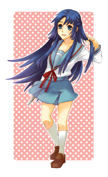 00s1girlblue eyesblue hairfemale focuskneehighsknifeloaferslong hairlooking at viewermatching hair/eyesoutside borderpolka dotpolka dot backgroundschool uniformserafukushoesskirtsmilesockssolostandingwhite sockswindwind lift