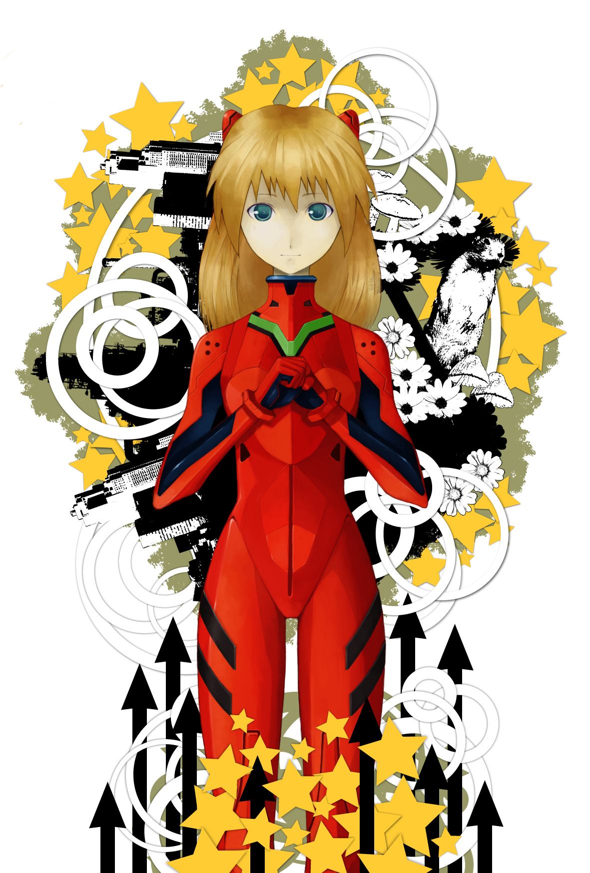 1girlarrow (symbol)blue eyesbodysuitbracerbuildingcircleclenched handsfemale focusflat chestflowergloveshair ornamenthands on own chestlong hairlooking at viewermecha pilot suitmushroomown hands togetherplugsuit (evangelion)red hairskinnyskyscrapersmilesolostandingstar (symbol)turtleneck