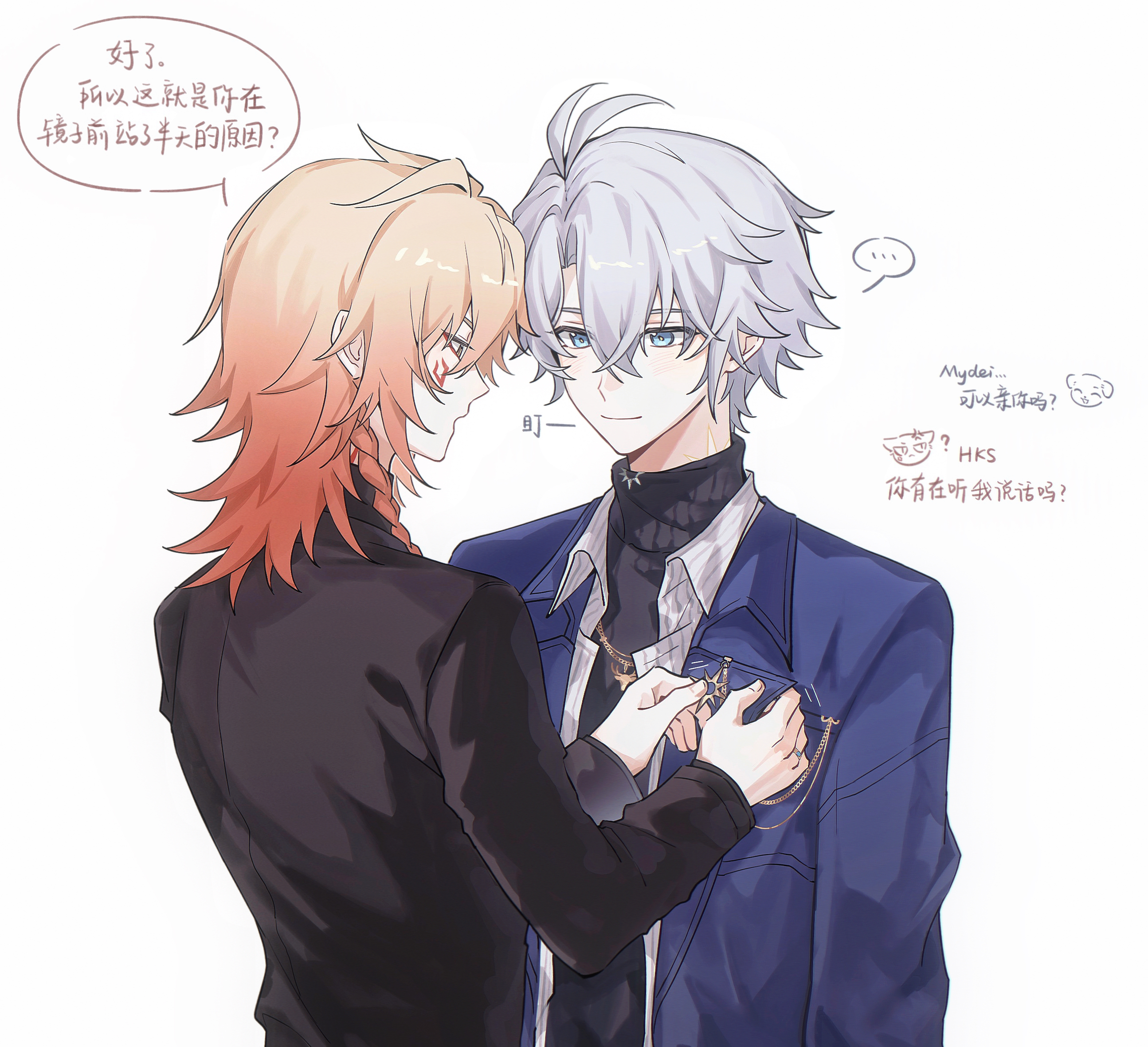 1boy2boysadjusting another's clothesantenna hairblack jacketblack sweaterblonde hairblue coatblue eyesbraidchinese textcoatcollared shirtfacial tattoogradient hairjacketlooking at anothermale focusmedium hairmulticolored hairmultiple boysopen clothesopen coatopen shirtred hairred tattooshirtshort hairside braidsimple backgroundspoken ellipsissweatertattooturtleneckturtleneck sweaterwhite backgroundwhite shirtyellow eyes