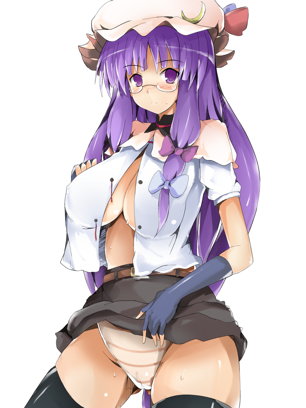 1girlalternate costumebeltbespectacledblushbowbreastsfemale focusfingerless glovesglassesgloveshair bowhathuge breastslarge breastslong hairminiskirtno braopen clothesopen shirtpantiespantyshotpencil skirtpurple eyespurple hairribbonshirtskirtsockssolosweatthighhighsunderwearupskirt