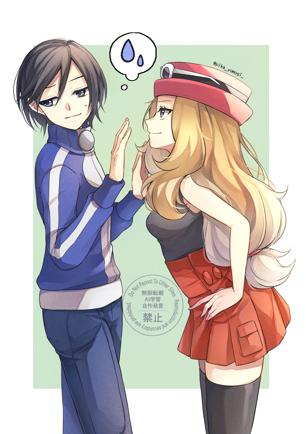 1boy1girlblack hairblack thighhighsblonde hairblue eyesblue jacketbreastsclosed moutheyewear on headweargrey eyeshatjacketlong hairlong sleevespantspink hatred hatred skirtshirtshort hairskirtsleevelesssleeveless shirtsmilesunglassesthighhighswhite-framed eyewear