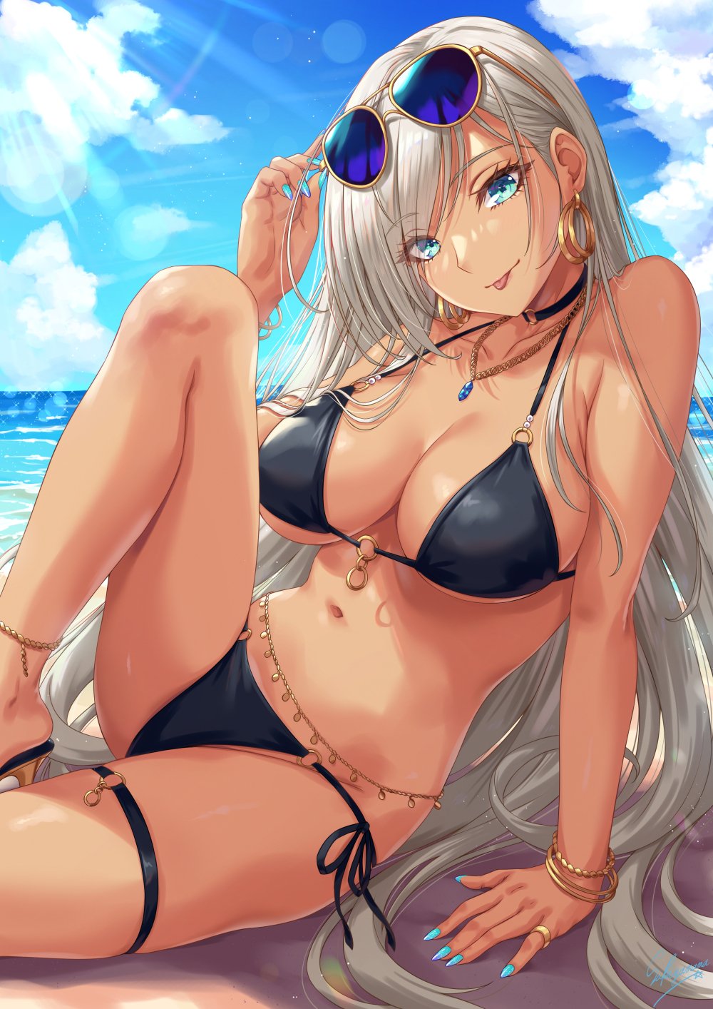 :p1girlaqua eyesaviator sunglassesbare armsbare shouldersbikiniblack bikiniblue nailsblue skybraceletbreastscleavageclosed mouthdark skindark-skinned femaledayearringseyewear on headgrey hairhigh heelsjewelrylarge breastslong hairlooking at viewermature femalenail polishnaveloceanoutdoorsringsandalsside-tie bikini bottomsittingskysmilesolostomachsunglassesswimsuittanthigh strapthighstonguetongue outunderboobwater
