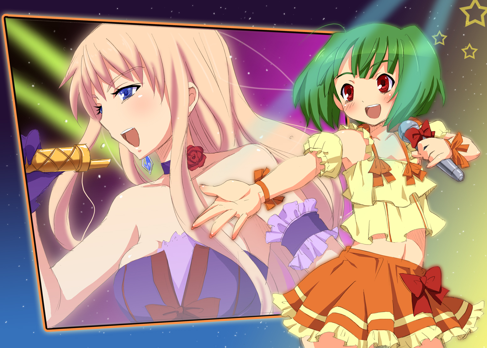 00s2girlsblonde hairblue eyesblushchokerdressgreen hairlong hairmicrophonemultiple girlsmusicorange skirtred eyesshort hairsingingskirt