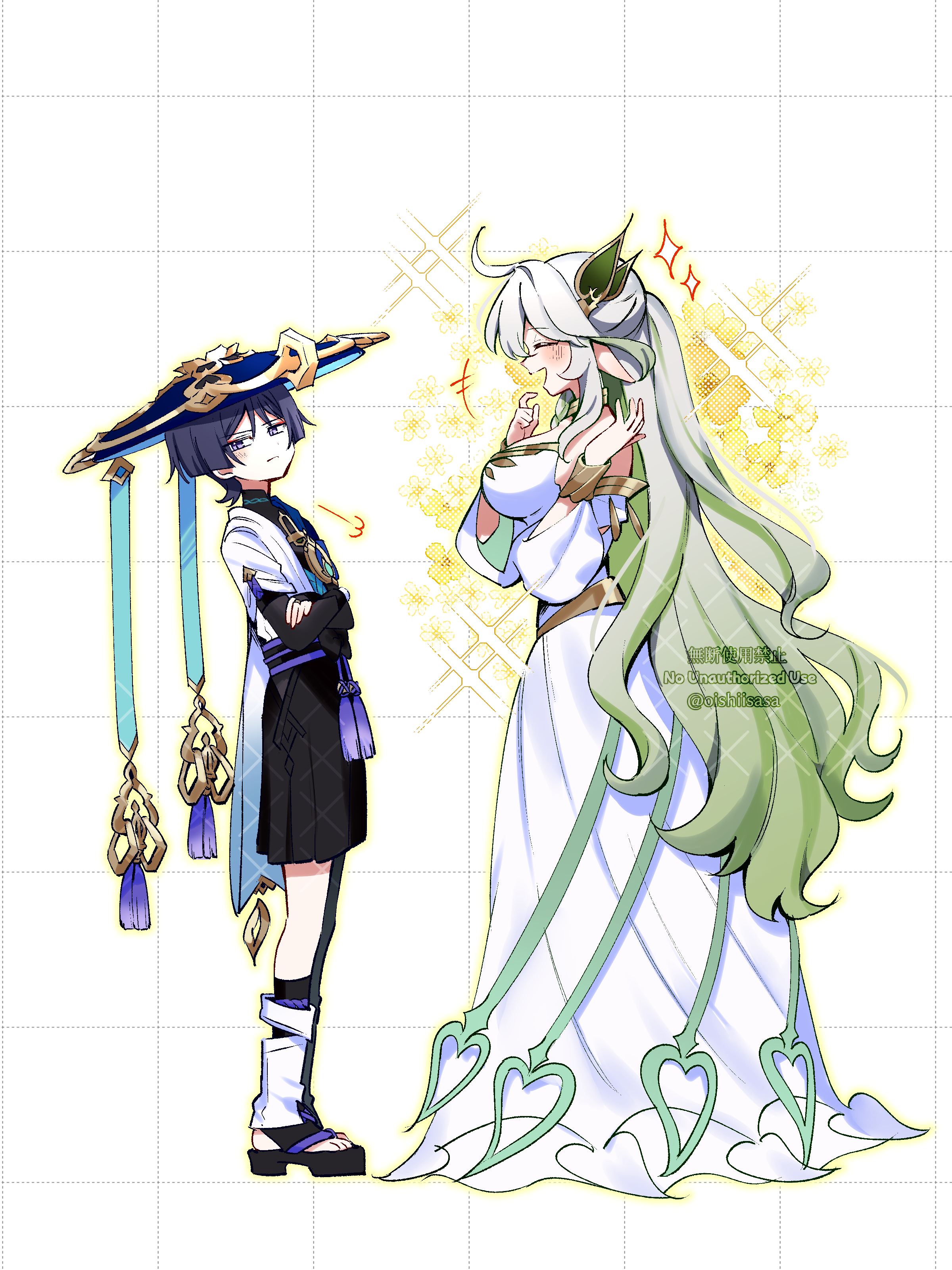 1boy1girlahogearmorbare shouldersblack bridal gauntletsblushbreastsbridal gauntletsclosed eyescrossed armsdetached sleevesdressfrom sidefrownfull bodygold trimgradient hairgreen hairhair between eyeshair ornamenthands uphatjapanese armorjingasalarge breastslong hairlooking to the sidemulticolored hairopen mouthpointy earspurple eyesshort hairstandingstraplessstrapless dresstasselvery long hairwhite dresswhite hairwhite sleeves