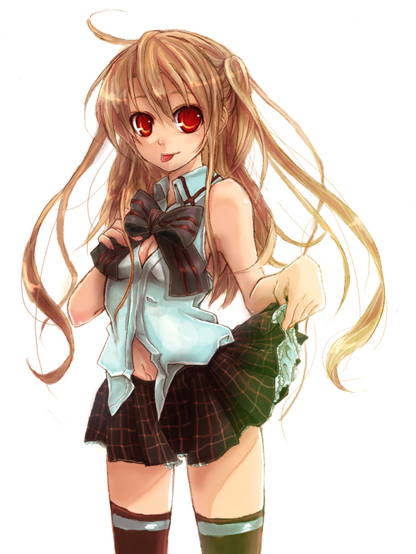 :p1girlahogeblonde hairbowclothes liftfemale focusfrillslong hairred eyesshirtskirtskirt liftsleevelesssleeveless shirtsolothighhighstonguetongue outzettai ryouiki