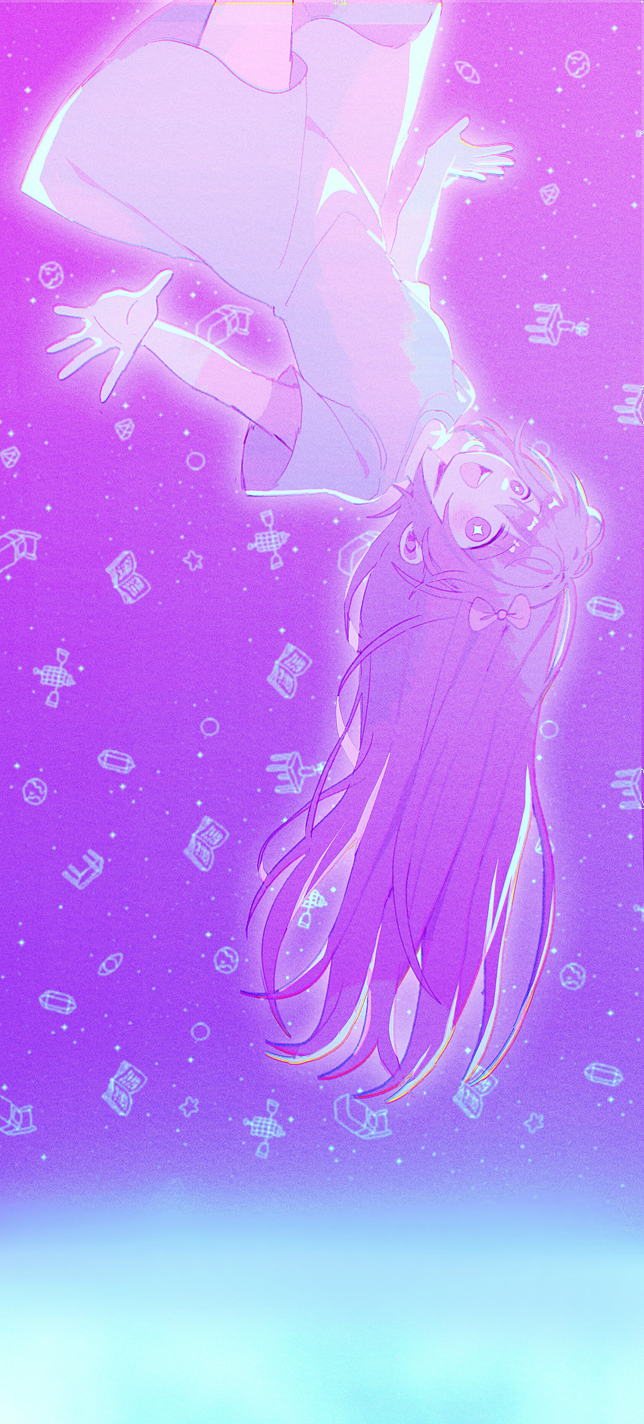oretsuu, mira (kpop demon hunters), rumi (kpop demon hunters), zoey (kpop demon hunters), kpop demon hunters, commentary, highres, 3girls, black hair, black jacket, braid, braided ponytail, brown hair, double bun, earrings, eyeshadow, hair bun, hoop earrings, jacket, jewelry, long hair, looking at viewer, makeup, multiple girls, pink hair, purple hair, sidelocks, smile, sparkle, twintails, upper body, white jacket