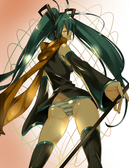 1girlassdetached sleevesfemale focusgreen hairgreen nailslong hairnail polishpantiesscarfsolostriped clothesstriped pantiesthighhighstwintailsunderwear